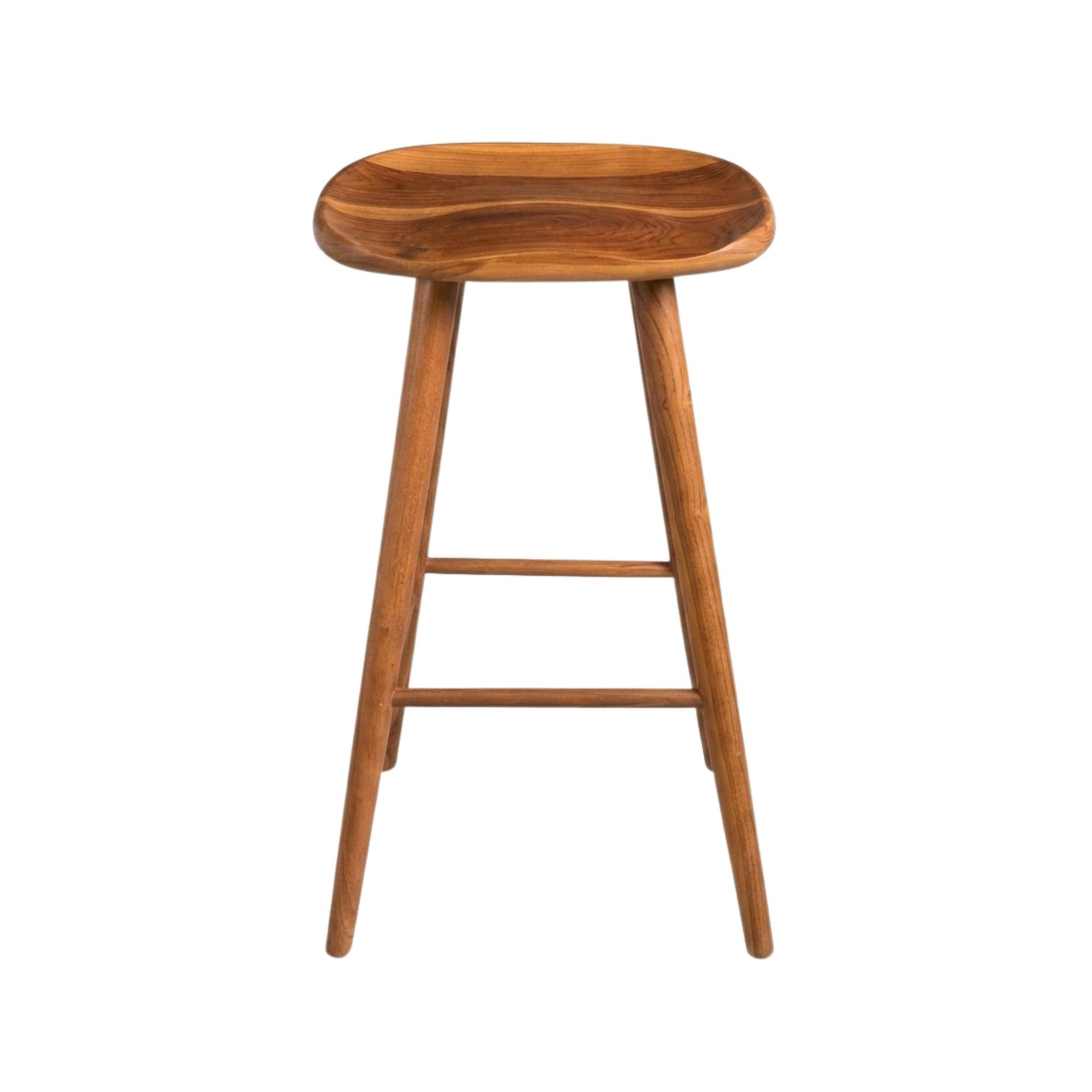 Front view of Banana Bar Stool made from solid teak wood with a softly curved seat.