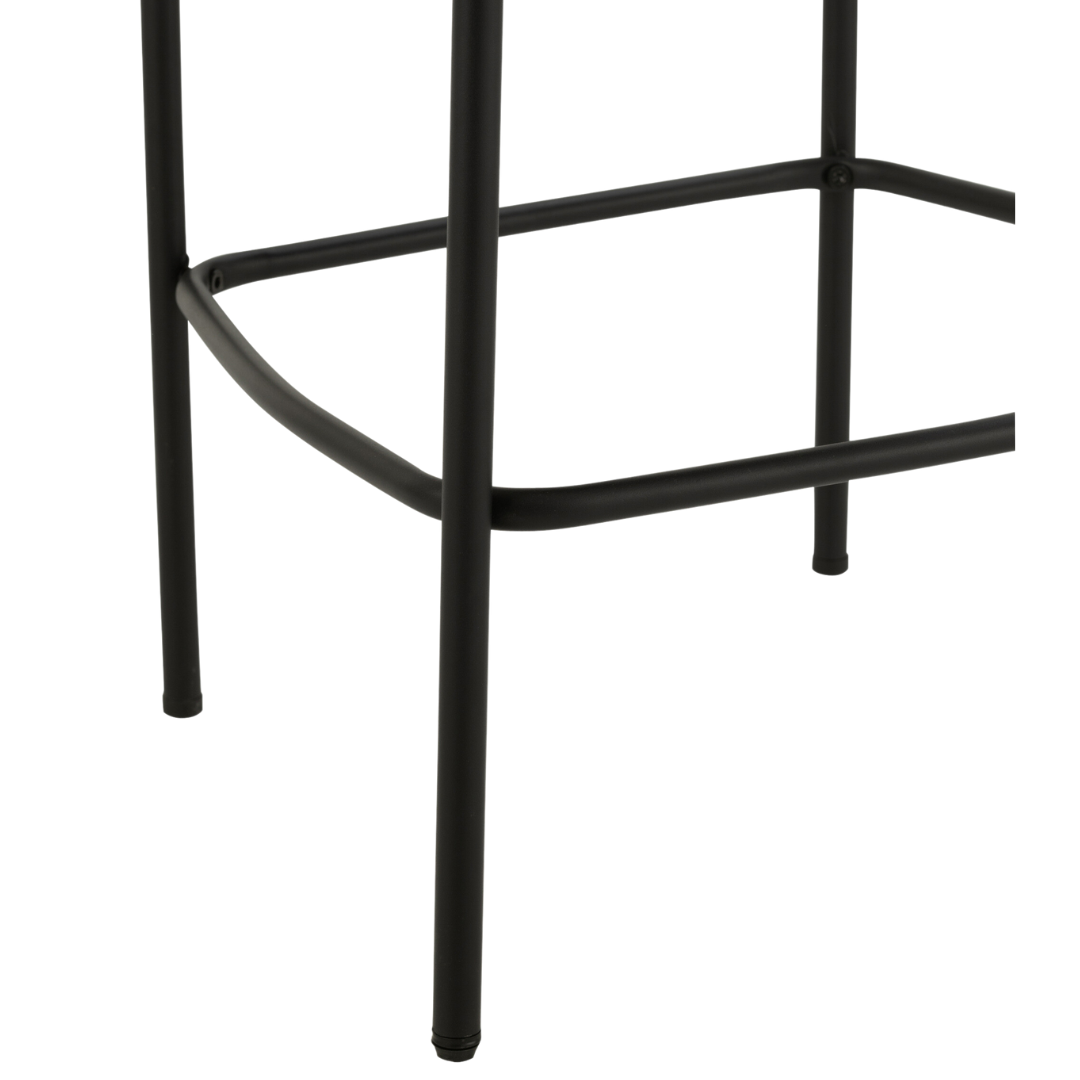 Front view of Gelia Bar Stool with upholstered seat and backrest in light fabric and black metal frame.