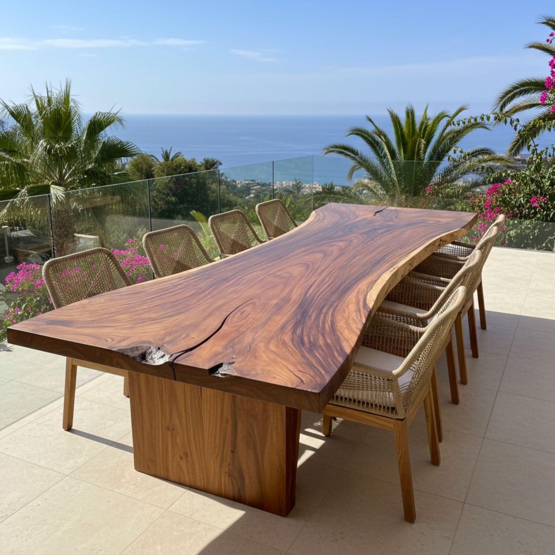 The Motu Nui Suar Wood Dining Table is a masterpiece of natural design, handcrafted from a single slab of solid suar wood. Its live-edge top preserves the tree’s original contours, while the rich grain patterns and tonal variations make each piece truly unique. Supported by bold, sculptural suar wood legs, it combines raw beauty with lasting strength.