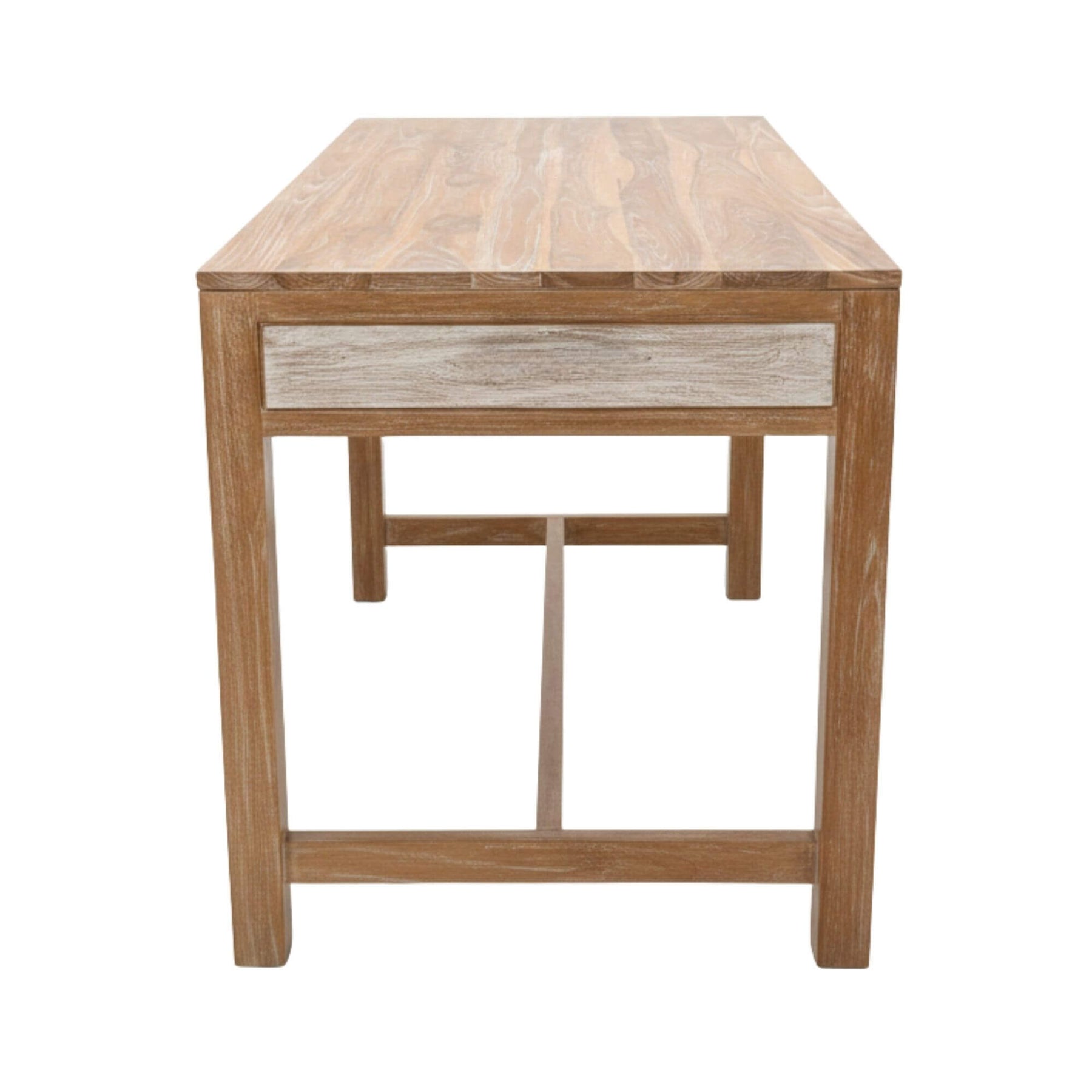 Side view of the whitewashed teak desk showing the solid frame.