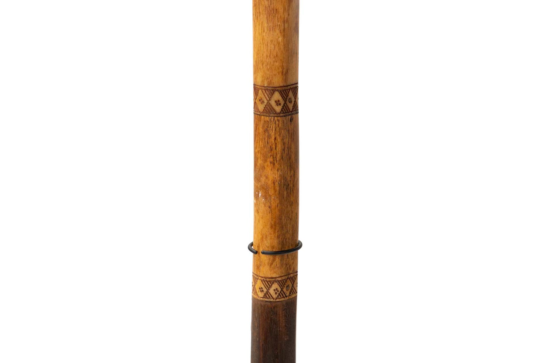 Detail view of the wooden shaft showing natural grain and engraved accents.