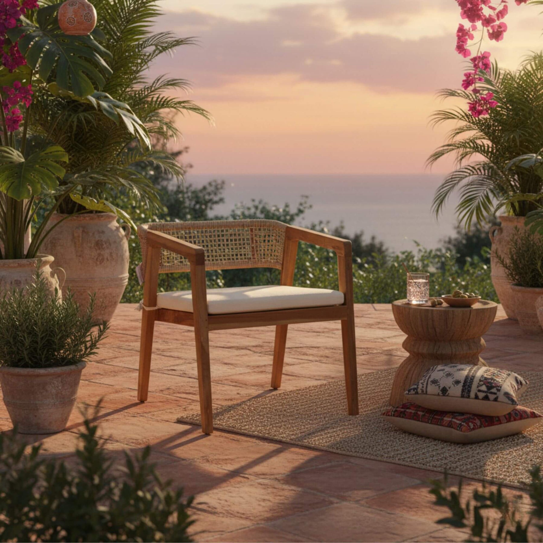 The Leira Dining Chair combines the warmth of natural teak with the durability of synthetic rattan, creating a versatile seating option for both indoor and outdoor spaces. Its clean-lined frame and handwoven backrest bring a relaxed yet refined look, while the cushioned seat ensures lasting comfort for long gatherings.