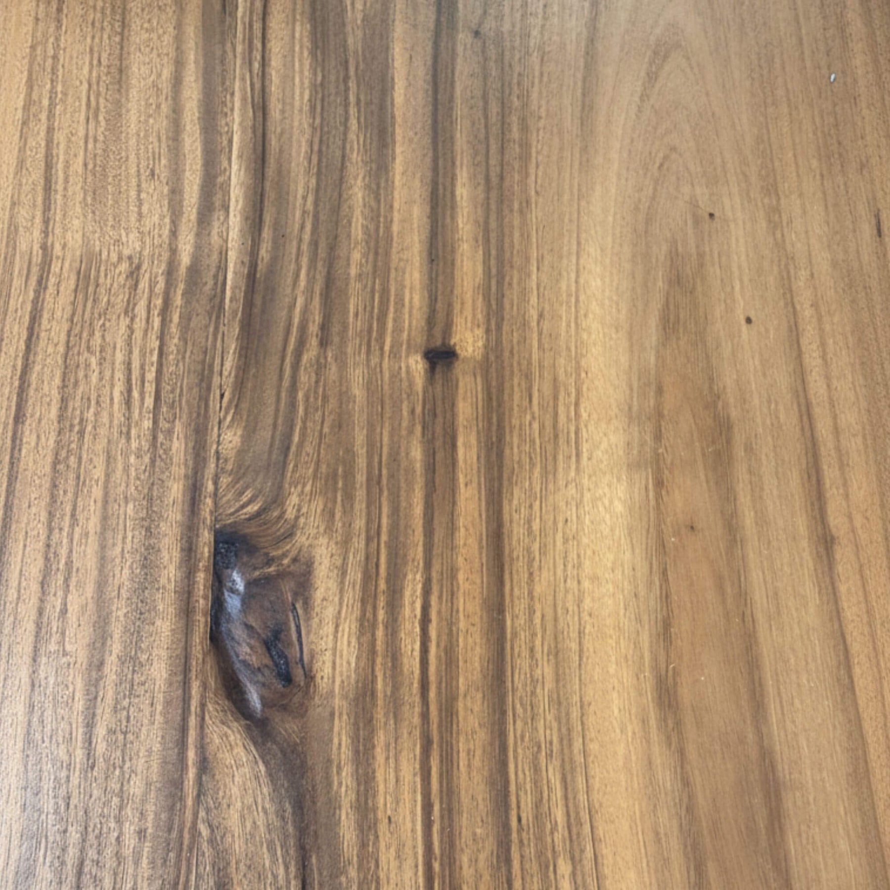 Close-up of the suar wood grain and natural tones on the tabletop.