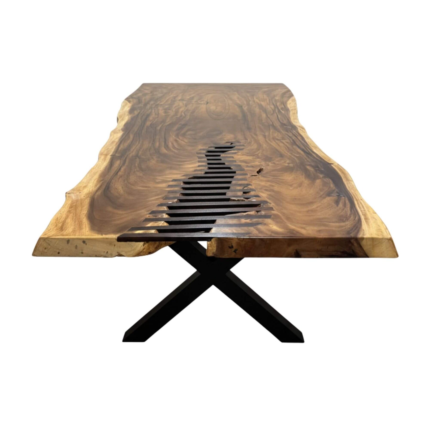 The Gunung Suar Dining Table celebrates the beauty of natural suar wood, featuring an impressive live edge and bold character. Each table showcases unique organic patterns and a sculptural metal base, merging rustic authenticity with modern design for an unforgettable dining experience.