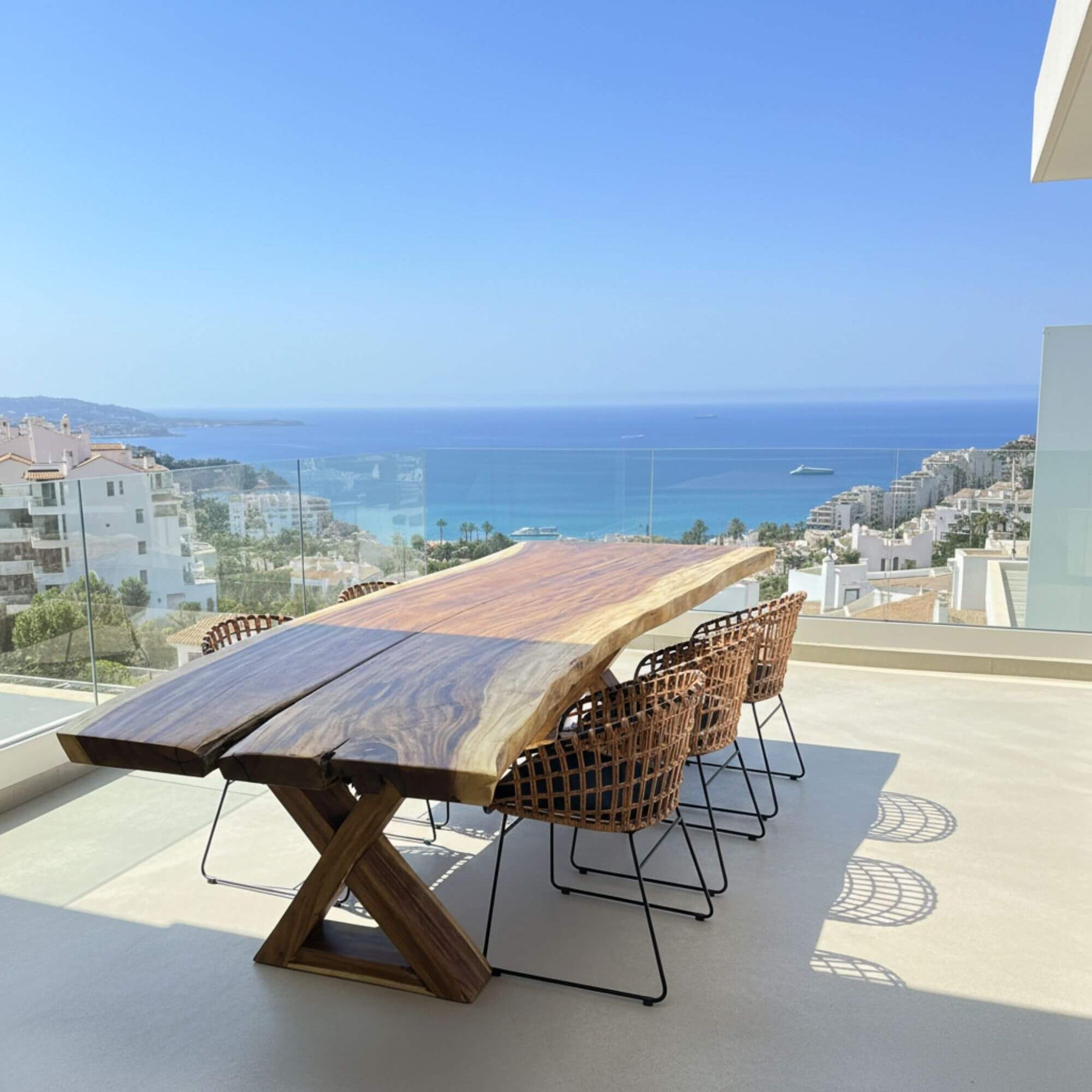 Motu nui suar wood dining table with chairs on a balcony overlooking the ocean.