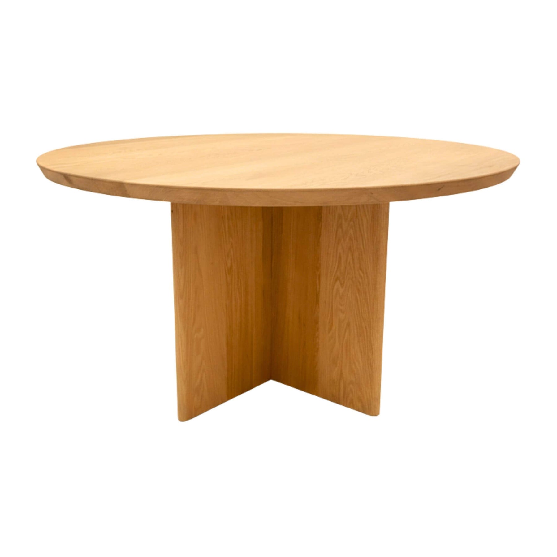Angled studio shot of the oak round dining table showing its X-leg structure.