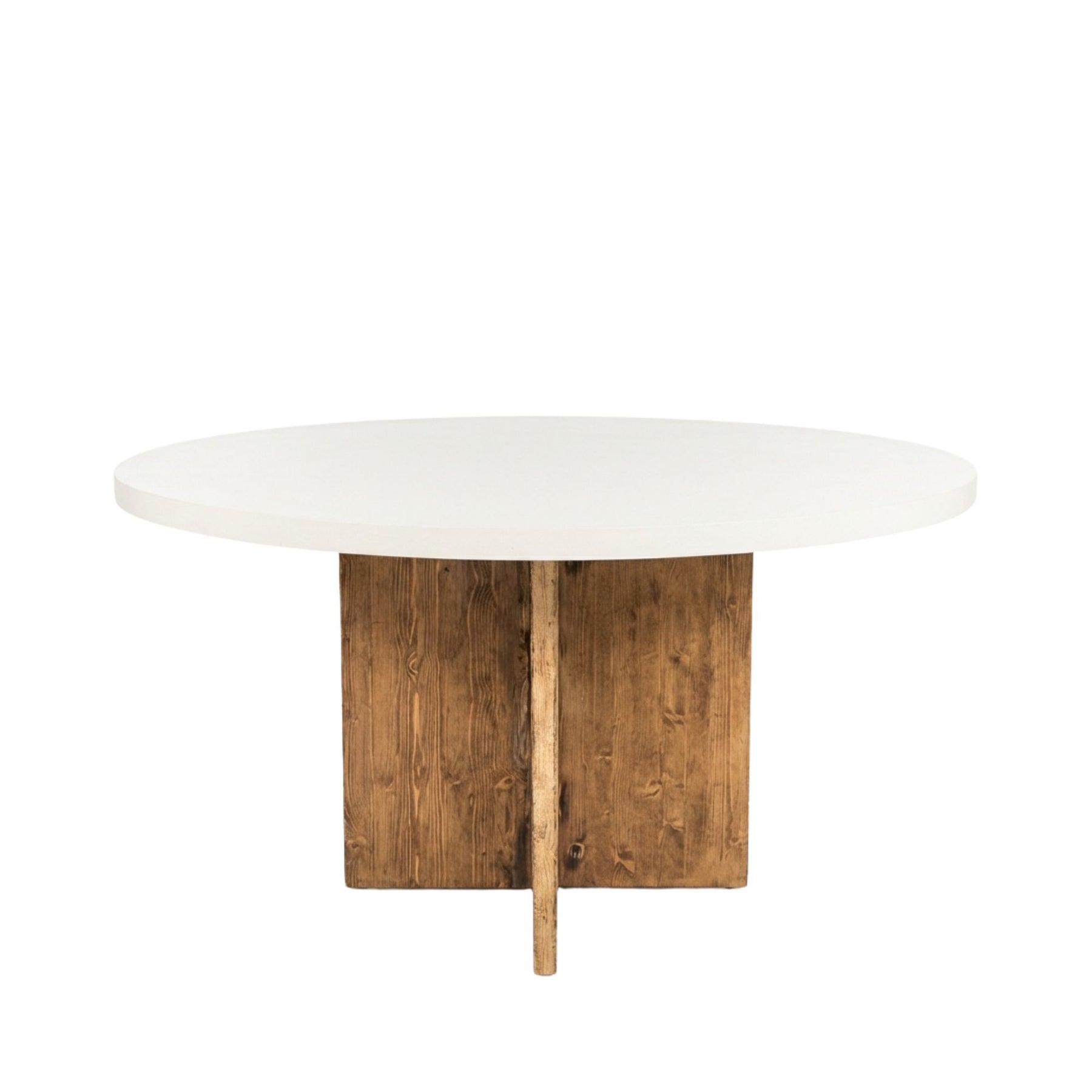 Front view of Terraline microcement round dining table showing its smooth circular top and solid wooden base.