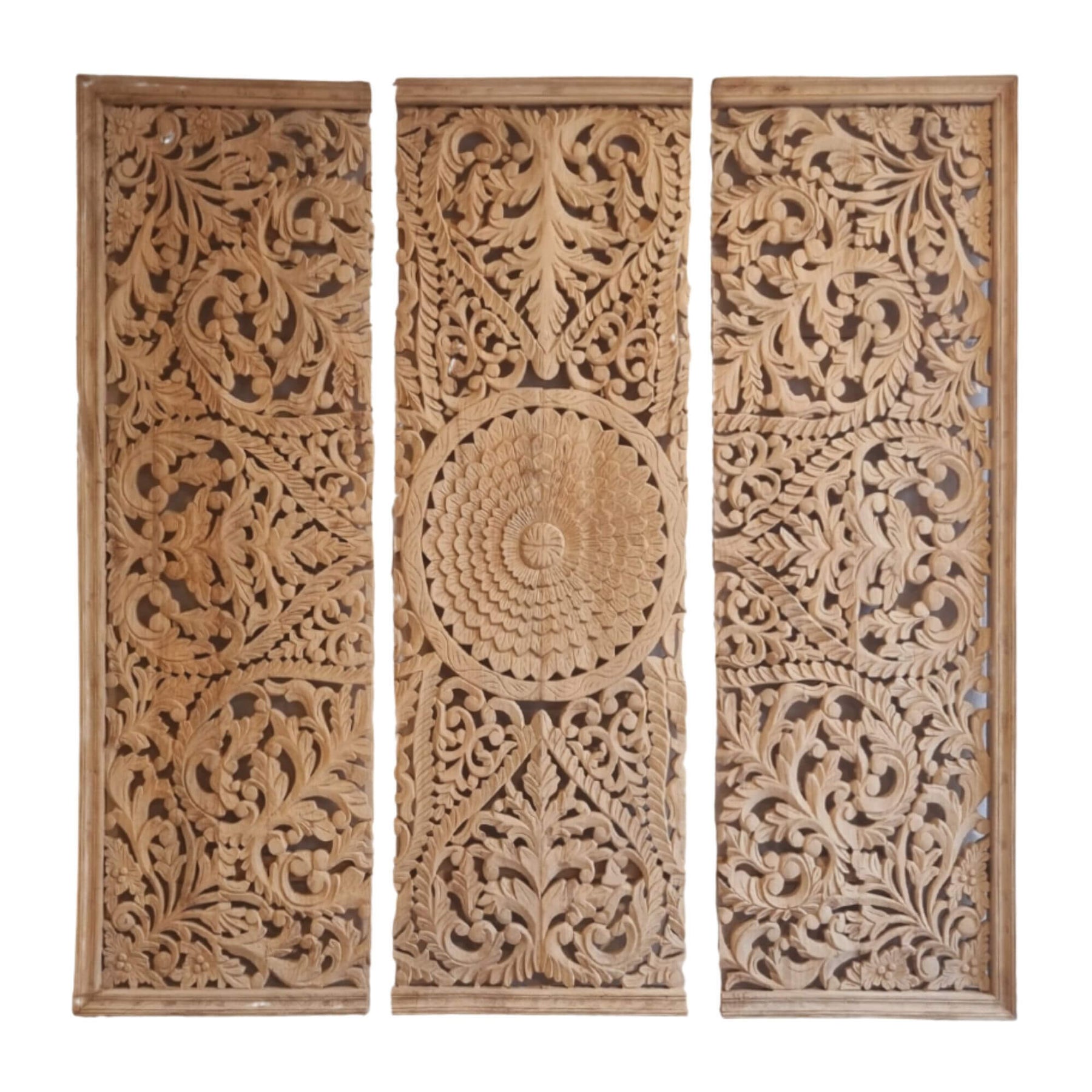 The Mandala Wall Deco from the White Briss Collection is an impressive handcrafted statement piece carved from reclaimed sheesham wood, featuring intricate mandala motifs that bring depth, texture, and natural warmth to any interior space.