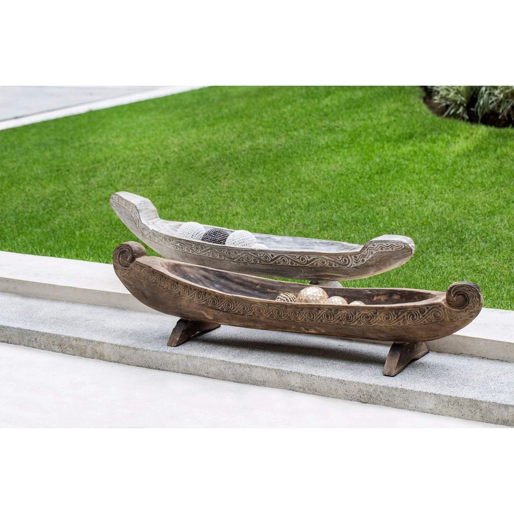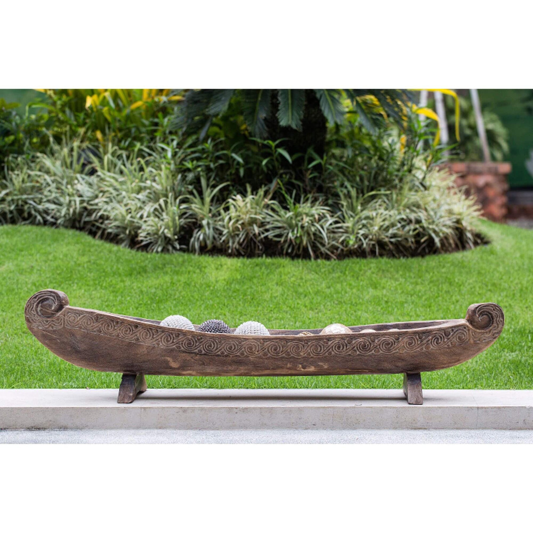The Calypso Teak Boat Decor is a striking decorative piece inspired by traditional wooden boats, reimagined as a sculptural centerpiece. Hand-carved from solid teak wood and finished in a blackwashed tone, its elongated form and intricate carved detailing bring depth, character, and a sense of coastal craftsmanship to any space. Ideal for styling consoles, dining tables, or outdoor covered areas, it creates a strong visual statement with natural elegance.