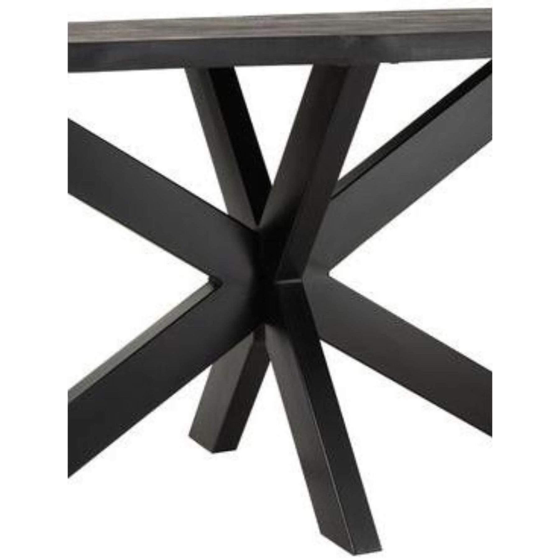 Close-up of the Black Acacia Dining Table base with crossed metal legs.