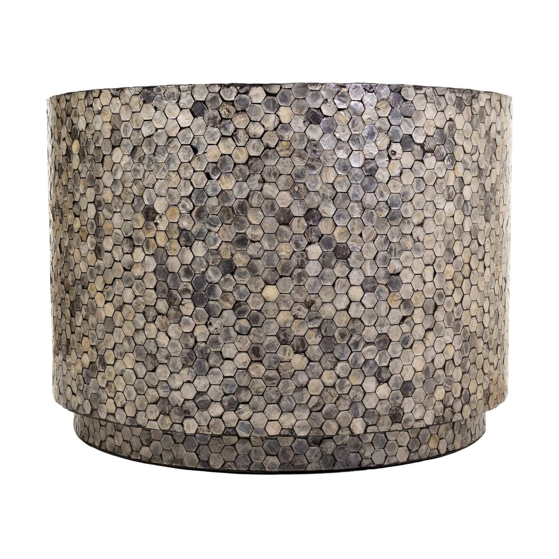 Front view of the grey Bruma Coffee Table showcasing hexagonal capiz tile surface and cylindrical shape.