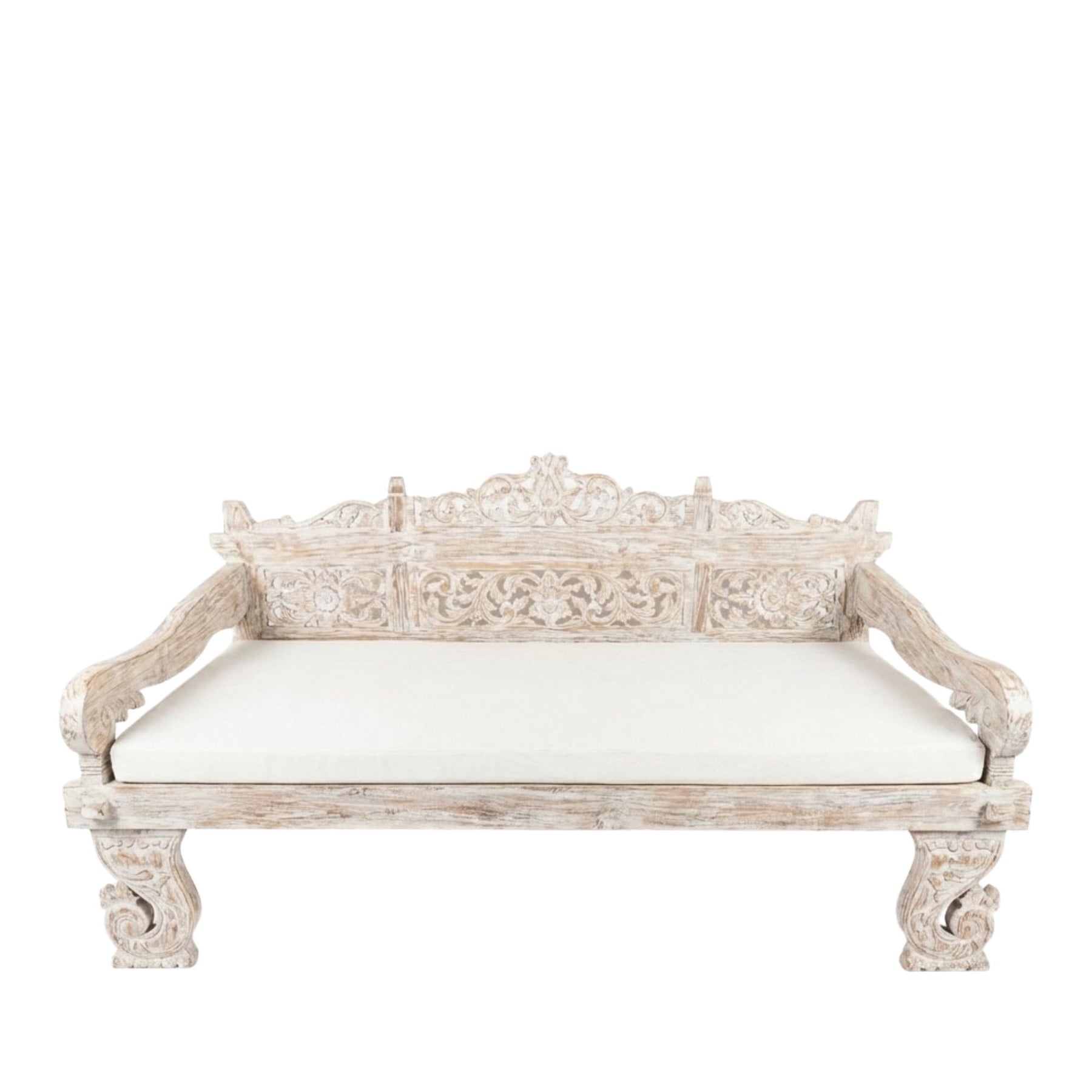 Front view of Whitewashed Ceres Carved Teak Wood Daybed highlighting its ornate carved backrest and solid teak structure.