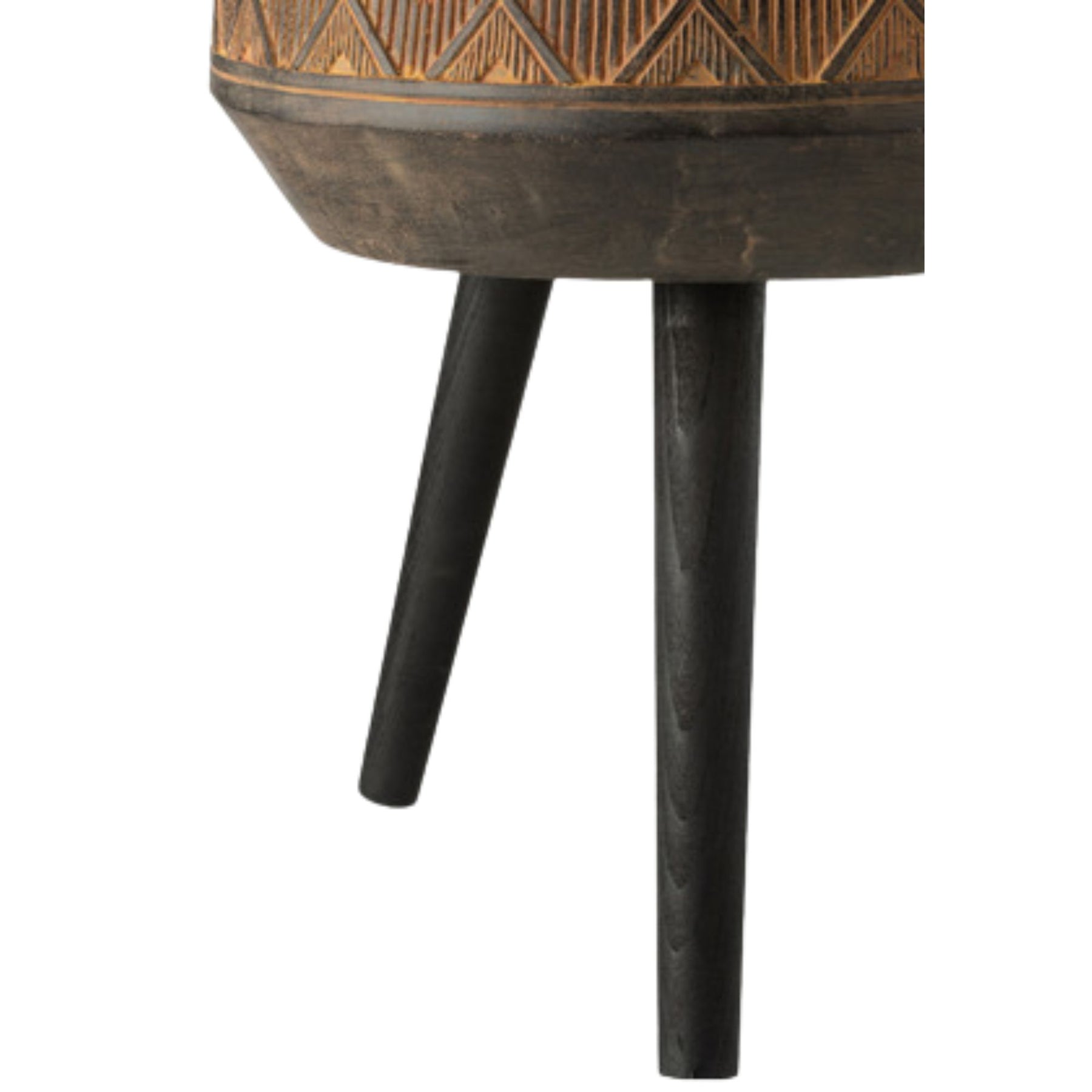 Front view of the Treasu Pot with carved terracotta body and wooden legs.