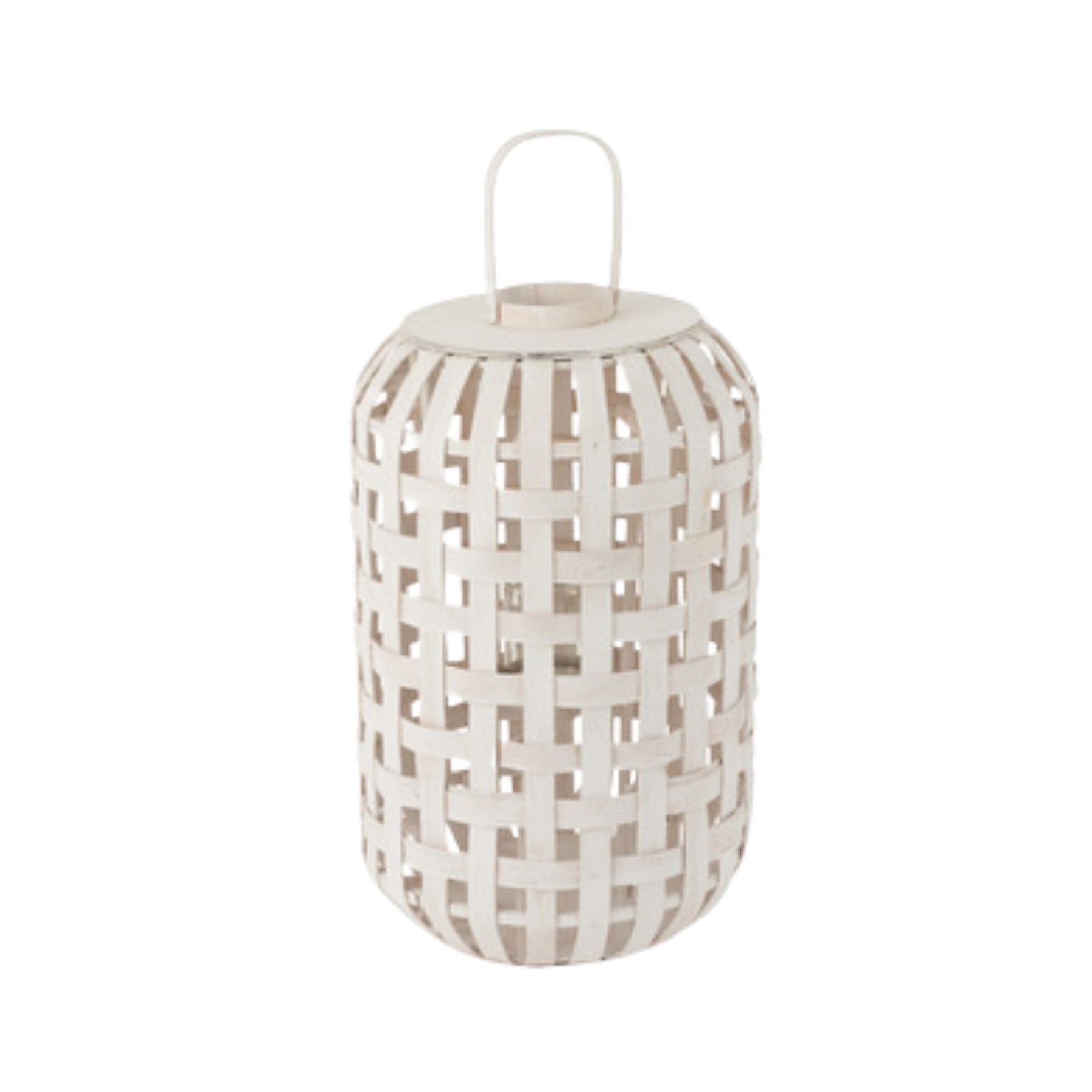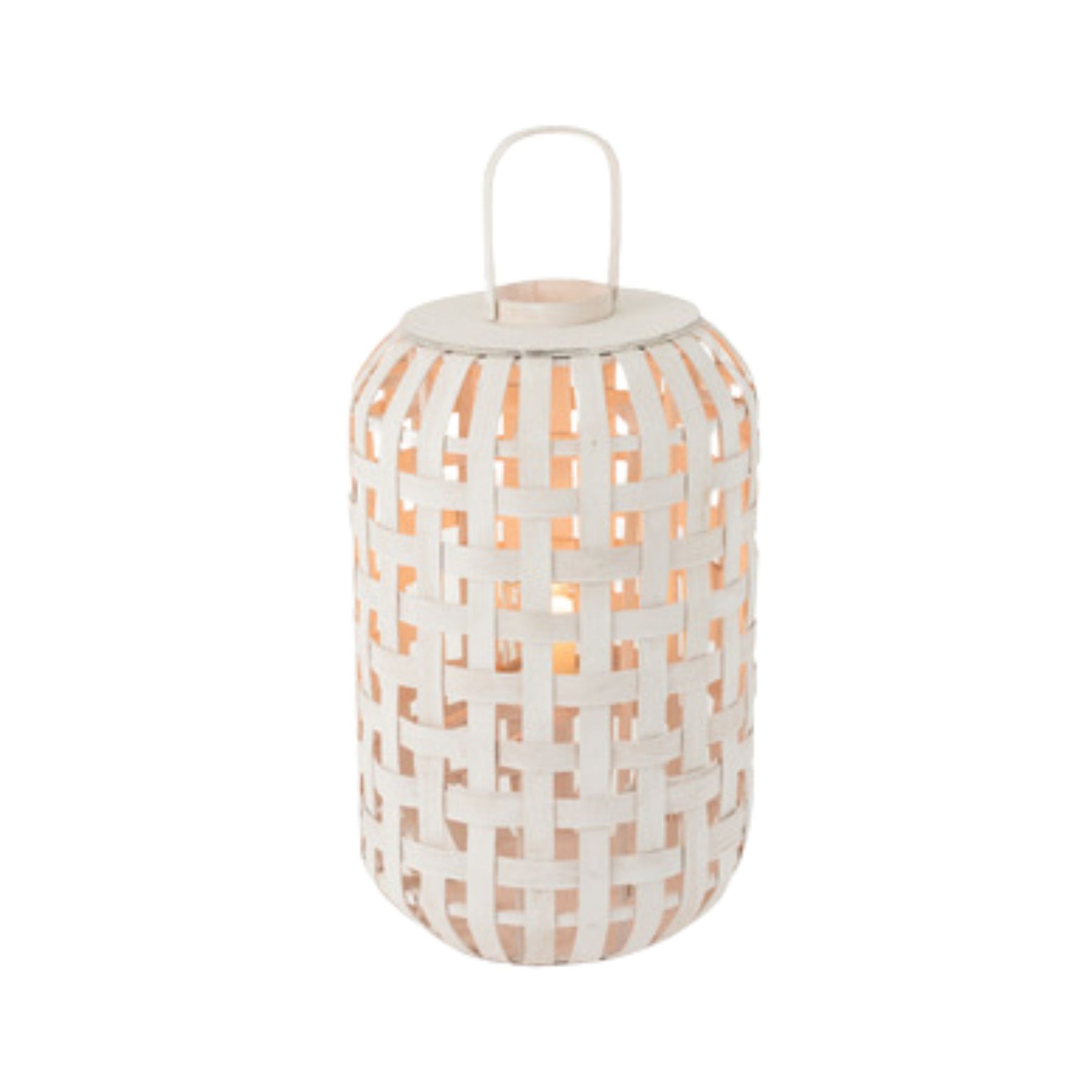 Front view of Beach lantern showcasing its whitewashed wooden weave and cylindrical shape.