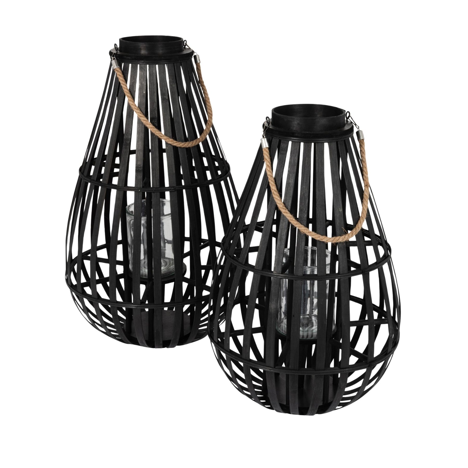 Front view of Drop lanterns in two sizes highlighting their teardrop shape and open woven bamboo structure.