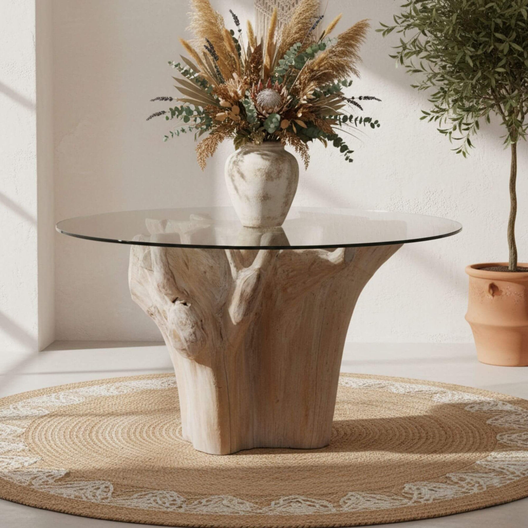 The Denpasar Dining Table showcases a striking fusion of natural teak root artistry and contemporary design. Its handcrafted base, shaped by nature, pairs with a refined circular glass top to create an iconic centrepiece for dining rooms and indoor-outdoor Mediterranean settings.