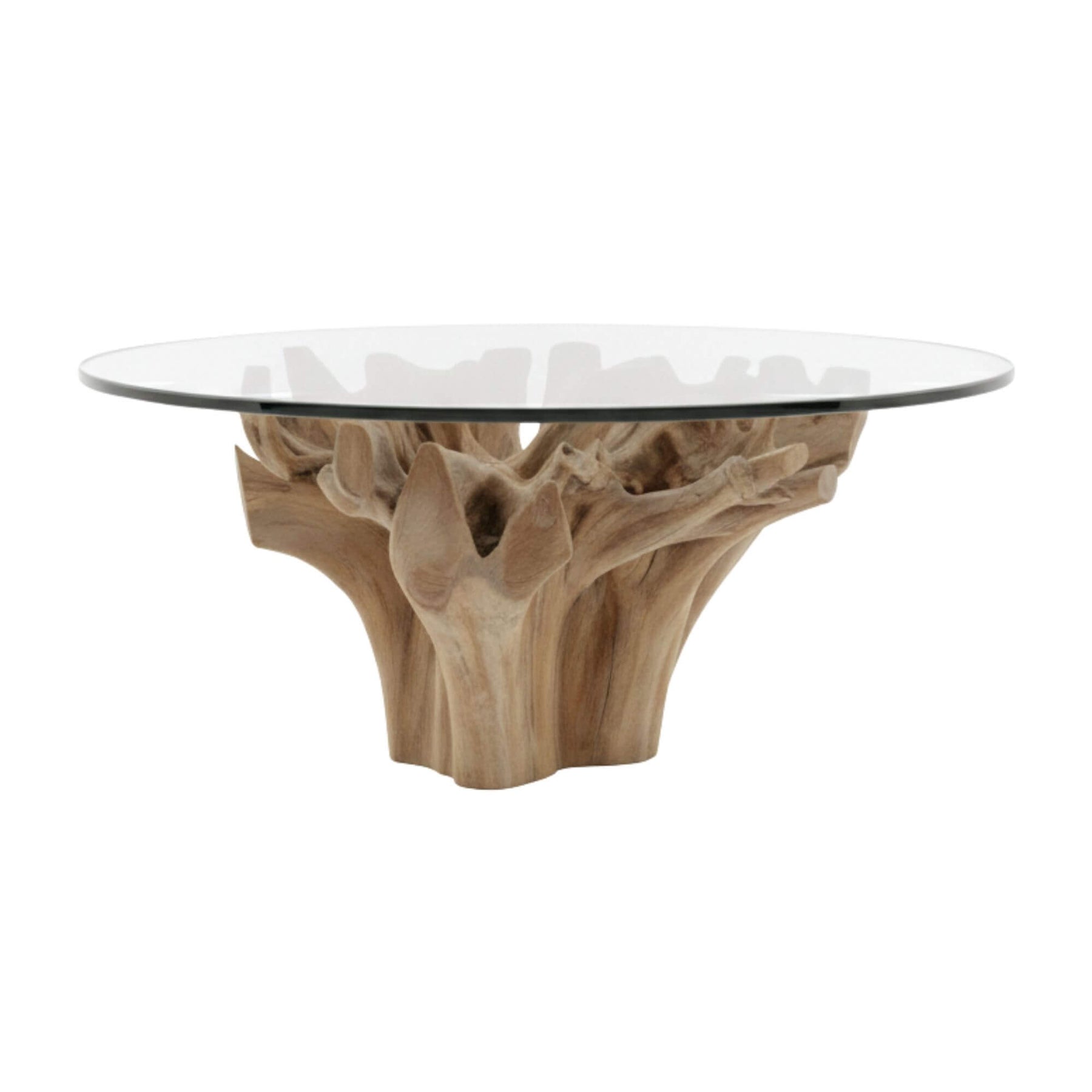 The Mur Teak Root Dining Table combines a stunning teak root base with a sleek tempered glass top. Each table is a one-of-a-kind piece of natural art, bringing organic texture and timeless beauty to your dining space.
