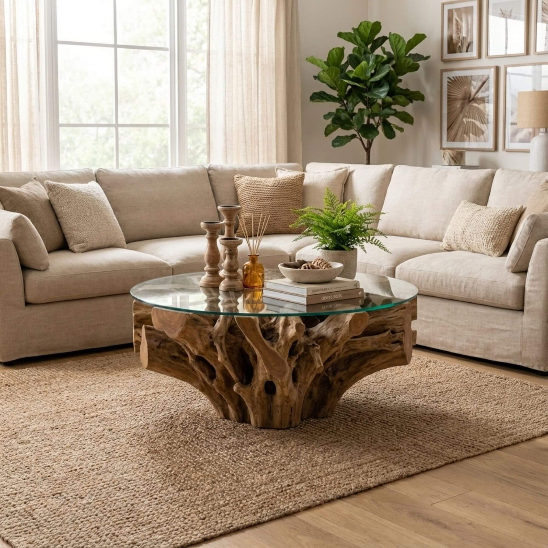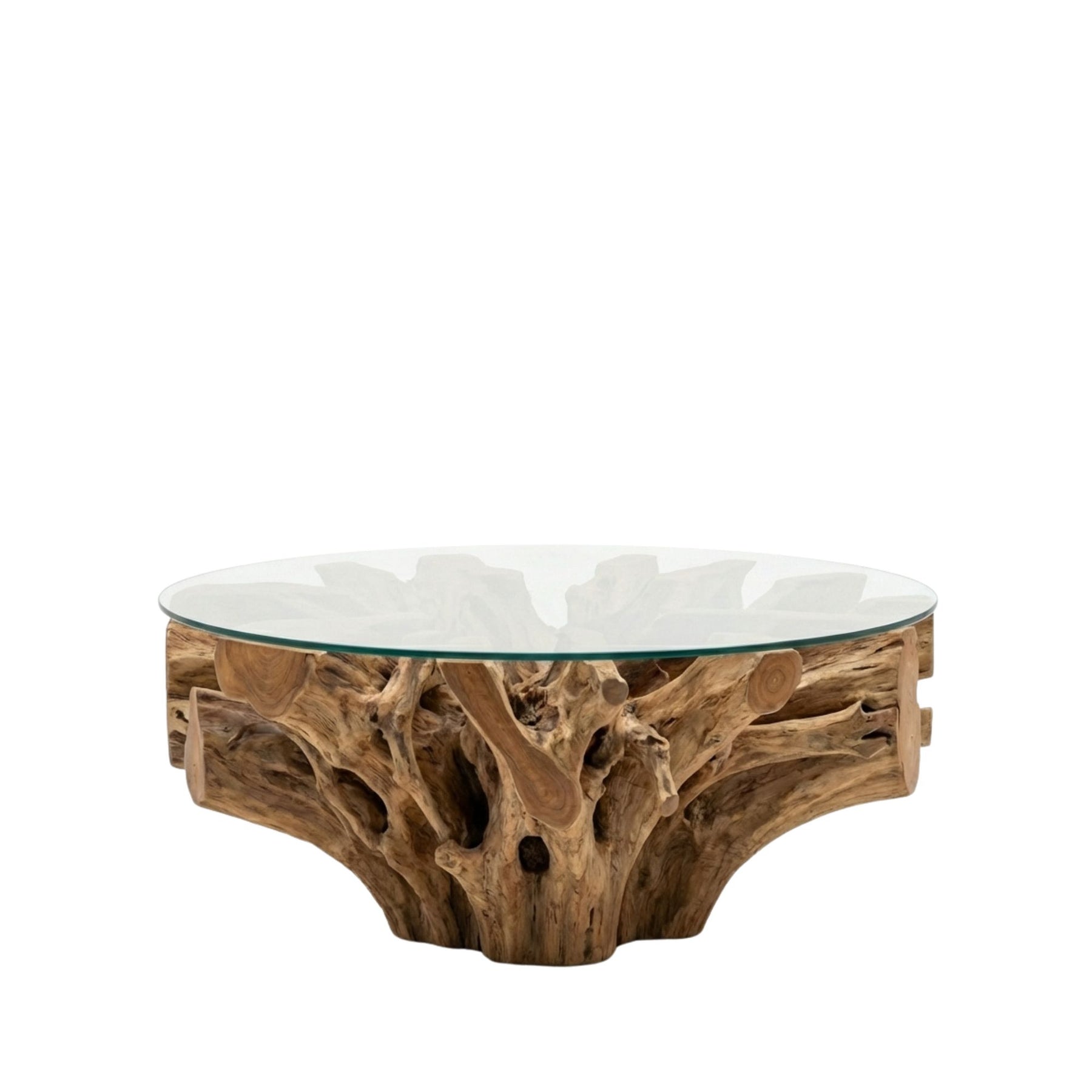 The Sumba Teak Root Coffee Table is a striking statement piece crafted from solid teak root and topped with tempered glass. Its sculptural base celebrates the raw, organic beauty of natural root formations, while the transparent glass surface allows the intricate structure to remain fully visible.