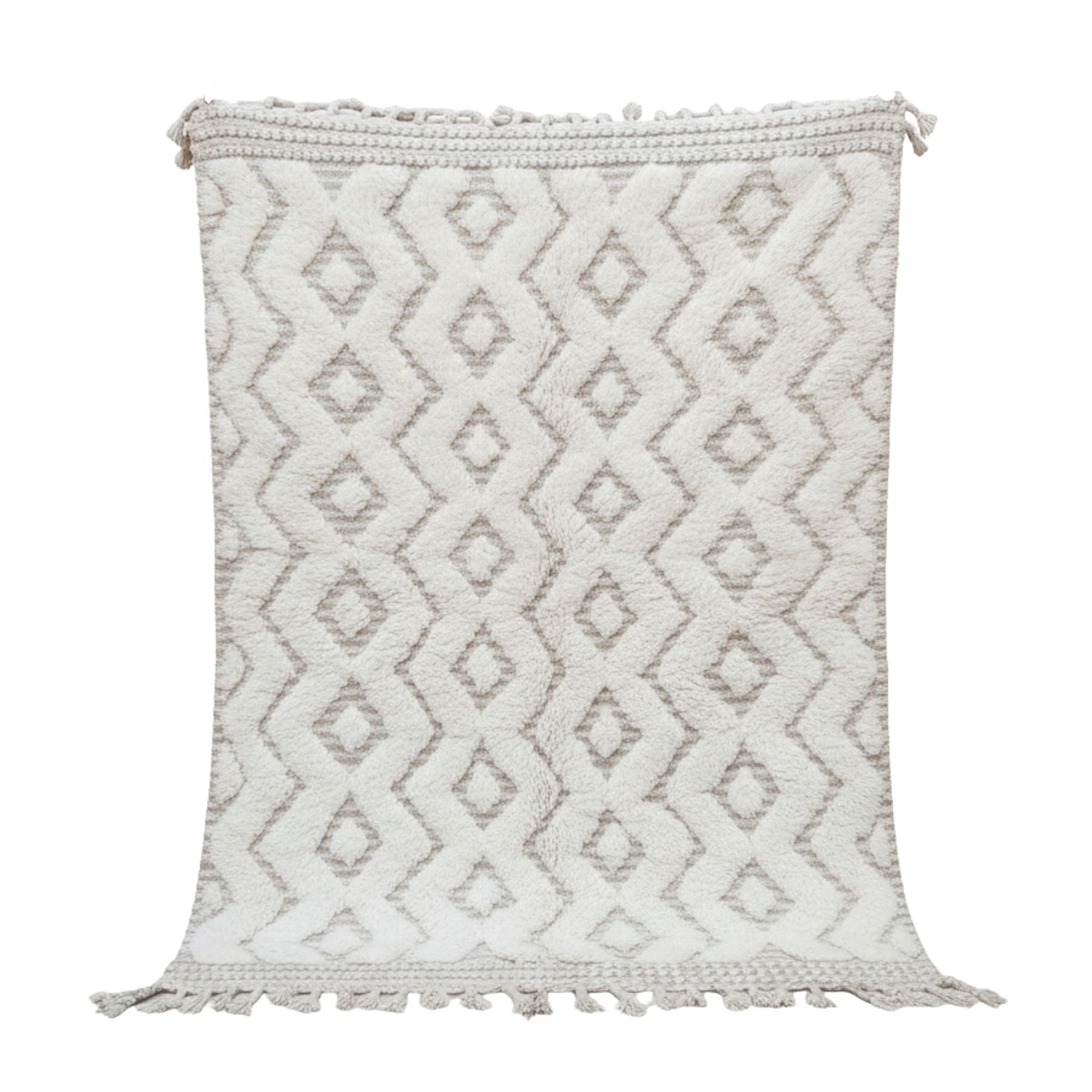 Front view of the Moroccan rug with raised cream-toned geometric pattern.