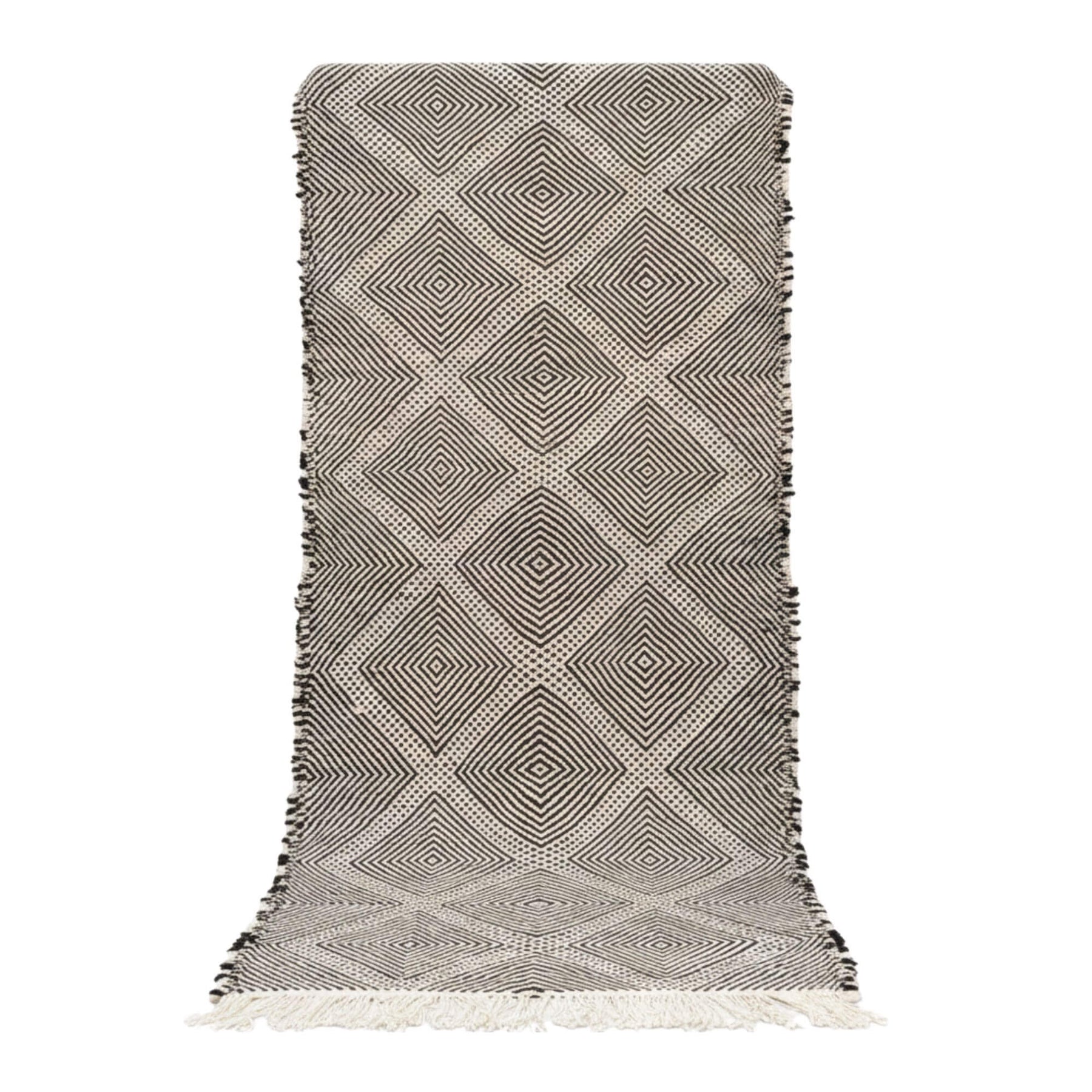 Front view of the Moroccan Rug in grey and cream tones with geometric diamond design.
