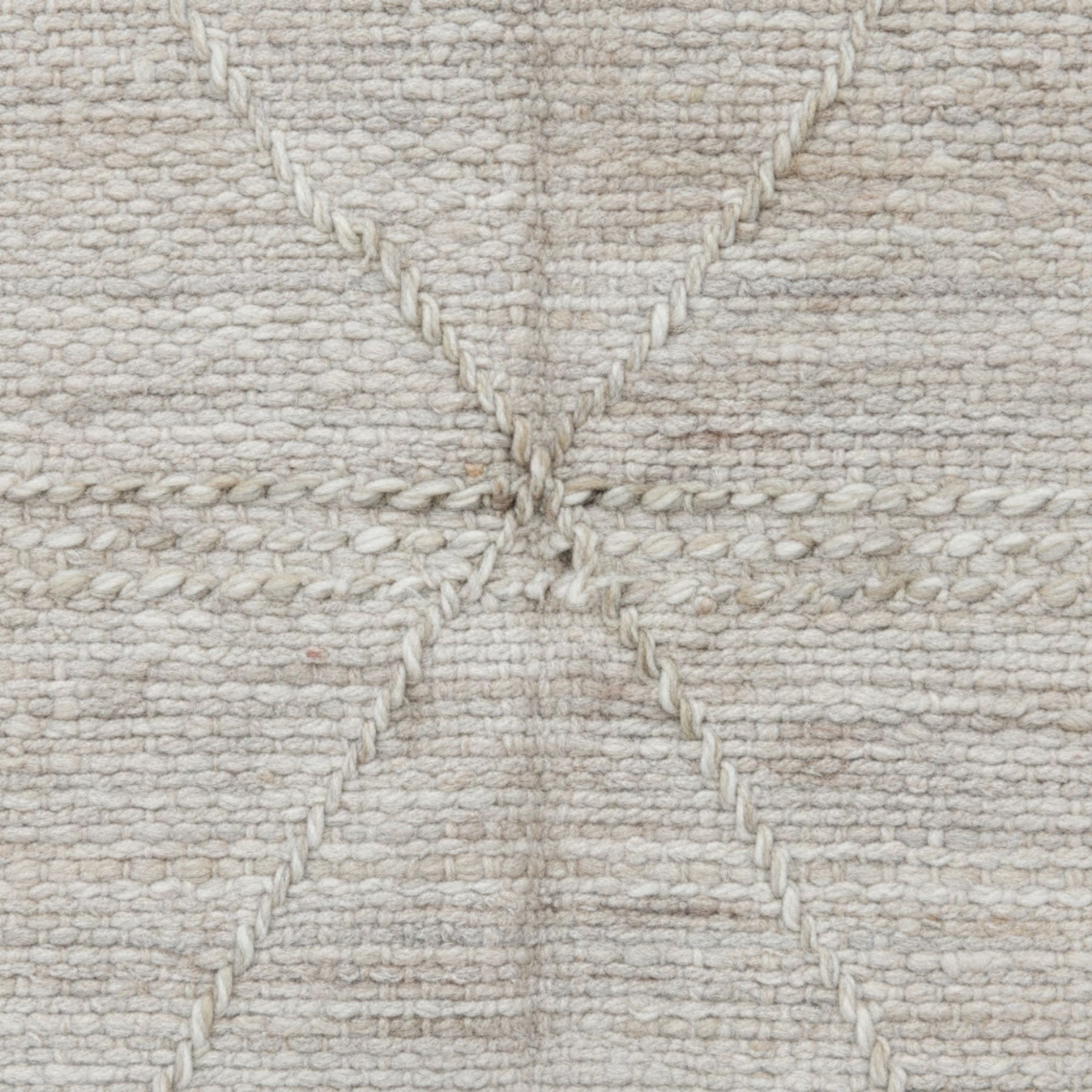 Front view of the large Moroccan rug with subtle cream-toned linear design.