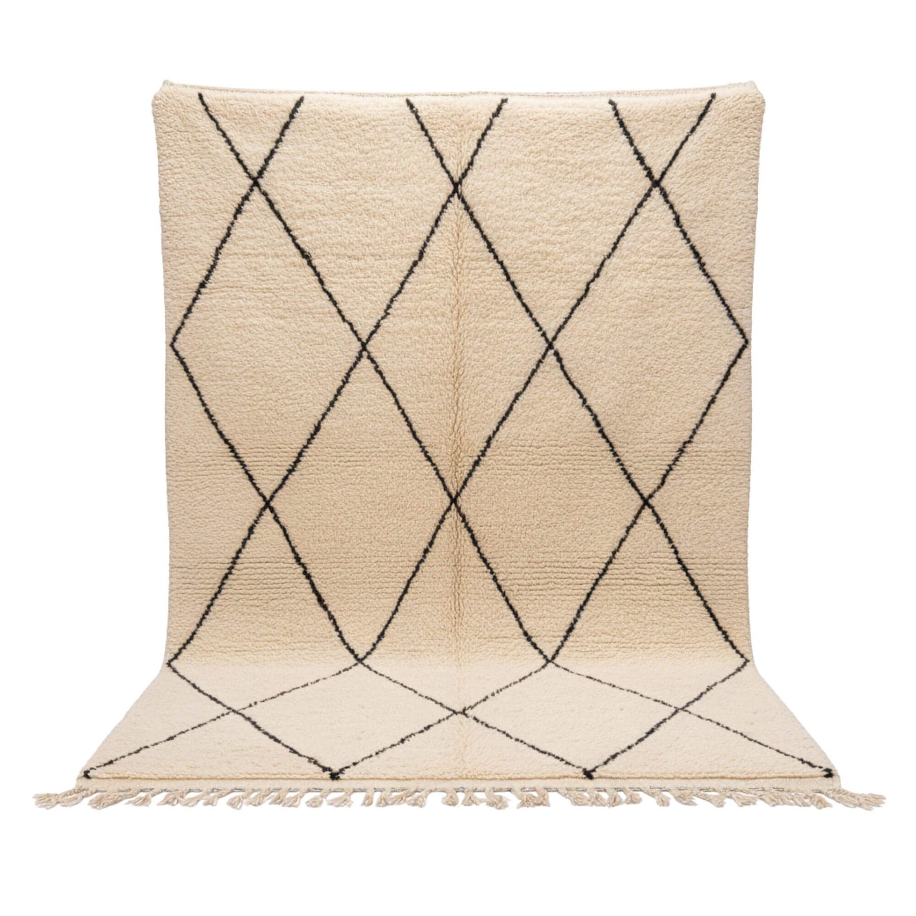 The Moroccan Rug combines traditional handwoven wool texture with a classic diamond pattern that enhances any interior. Its warm cream base and contrasting dark lines bring balance, authenticity and natural elegance to living rooms, lounges or serene reading spaces.