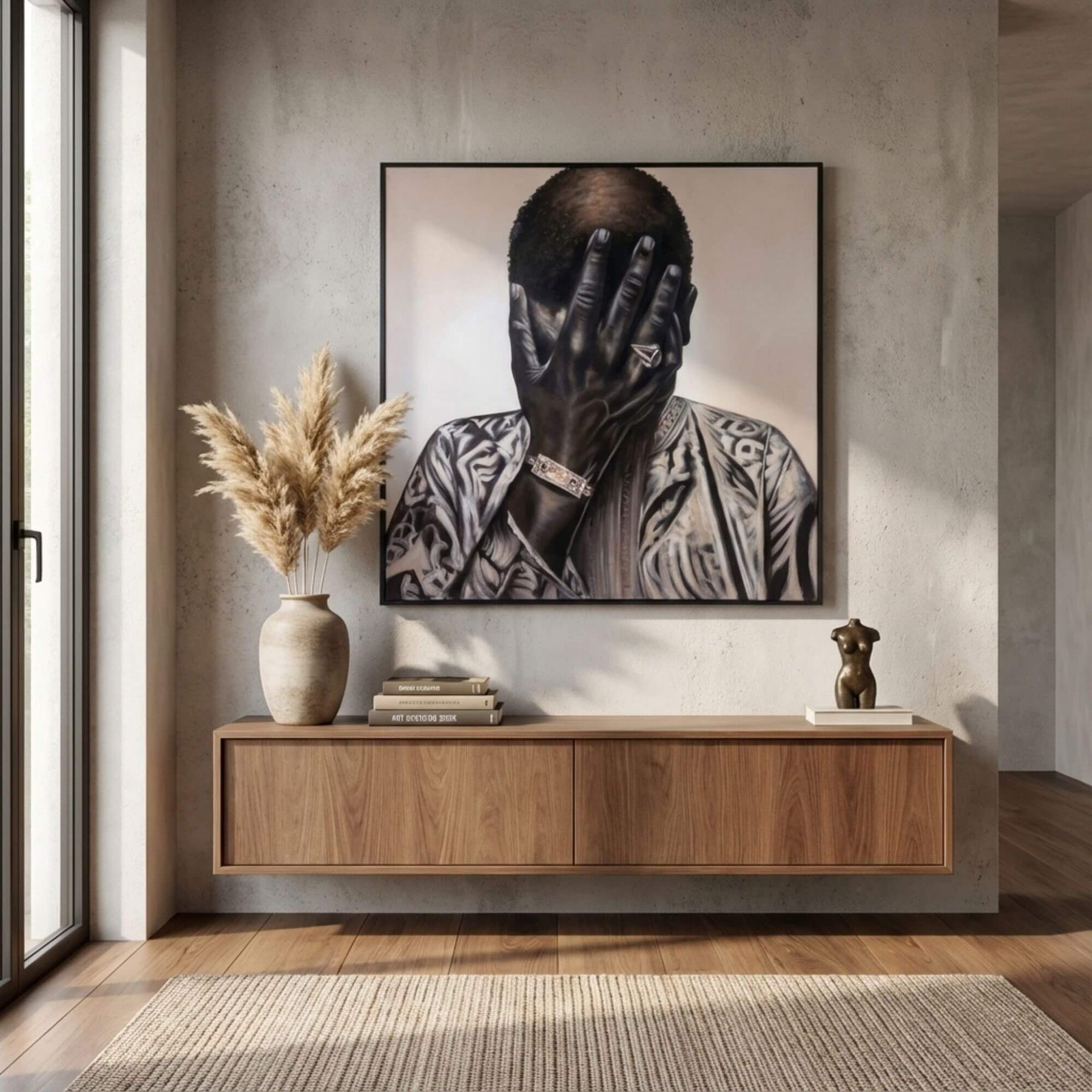 The Ndebele Canvas is a striking large-scale artwork that blends bold portraiture with graphic, symbolic patterns inspired by African tribal aesthetics. Its commanding presence and monochrome palette create a dramatic focal point, ideal for interiors that value artistic depth and cultural storytelling.