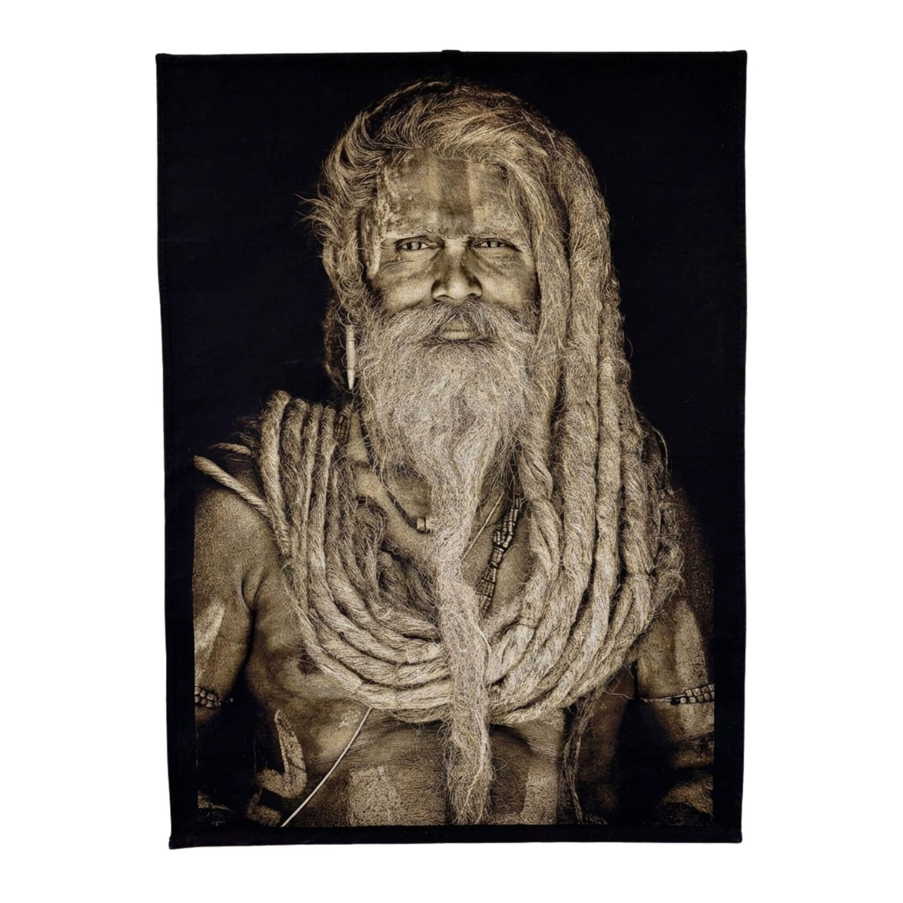 Front view of the Sadhu Man tapestry featuring a spiritual portrait in sepia tones on a black background.