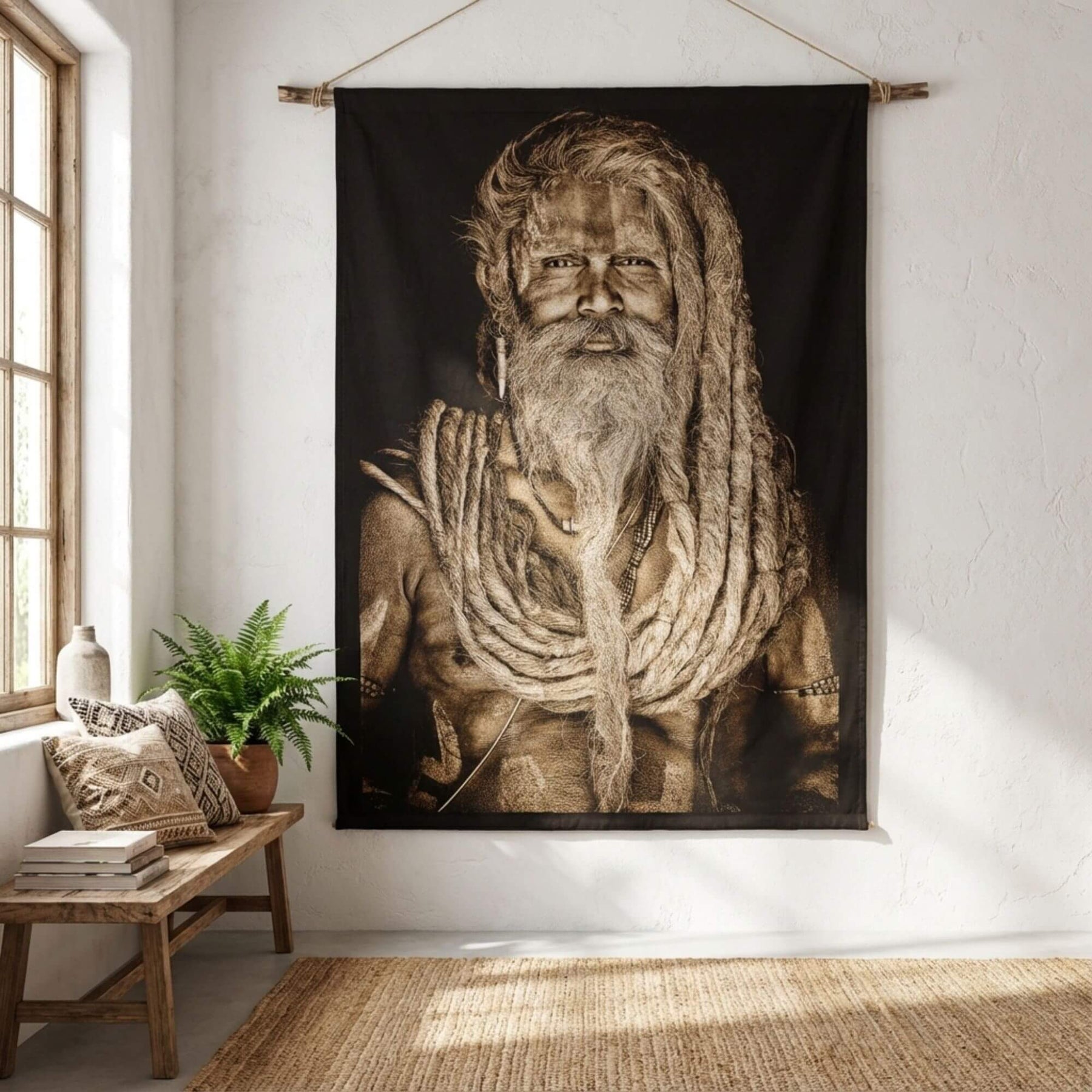 Interior styling scene showing the Sadhu Man tapestry as a statement wall hanging in a warm, natural space.