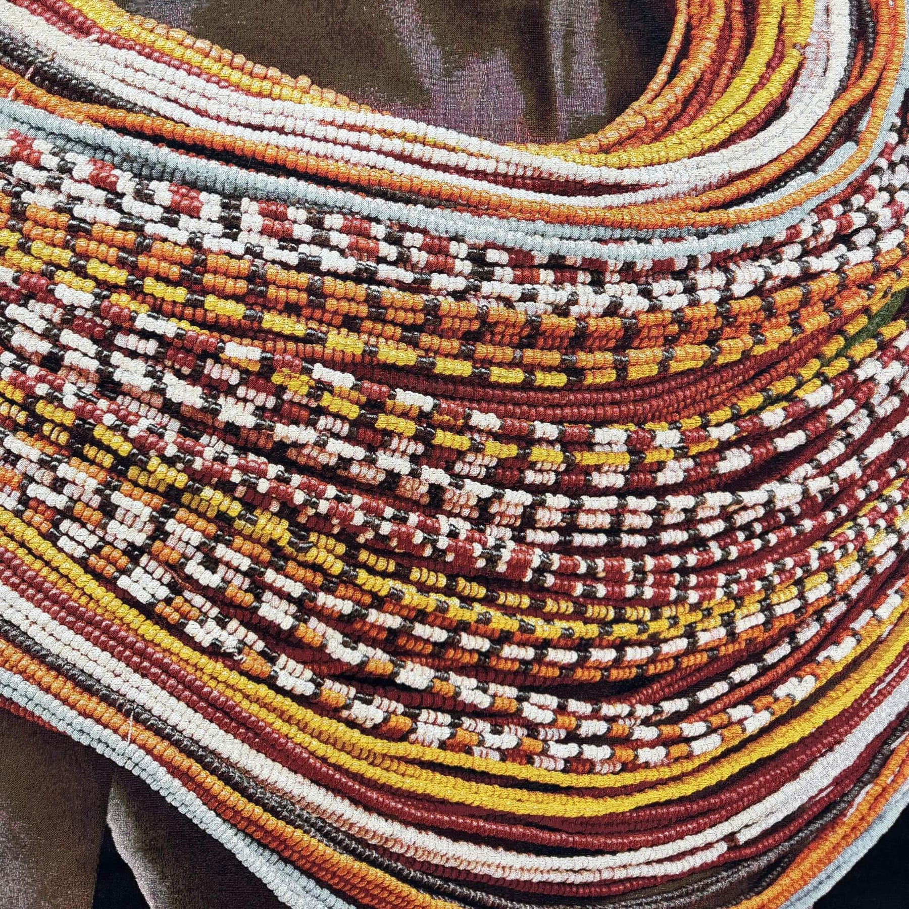 Close-up detail of the colorful beaded necklace pattern printed on the Samburu Girl fabric tapestry.
