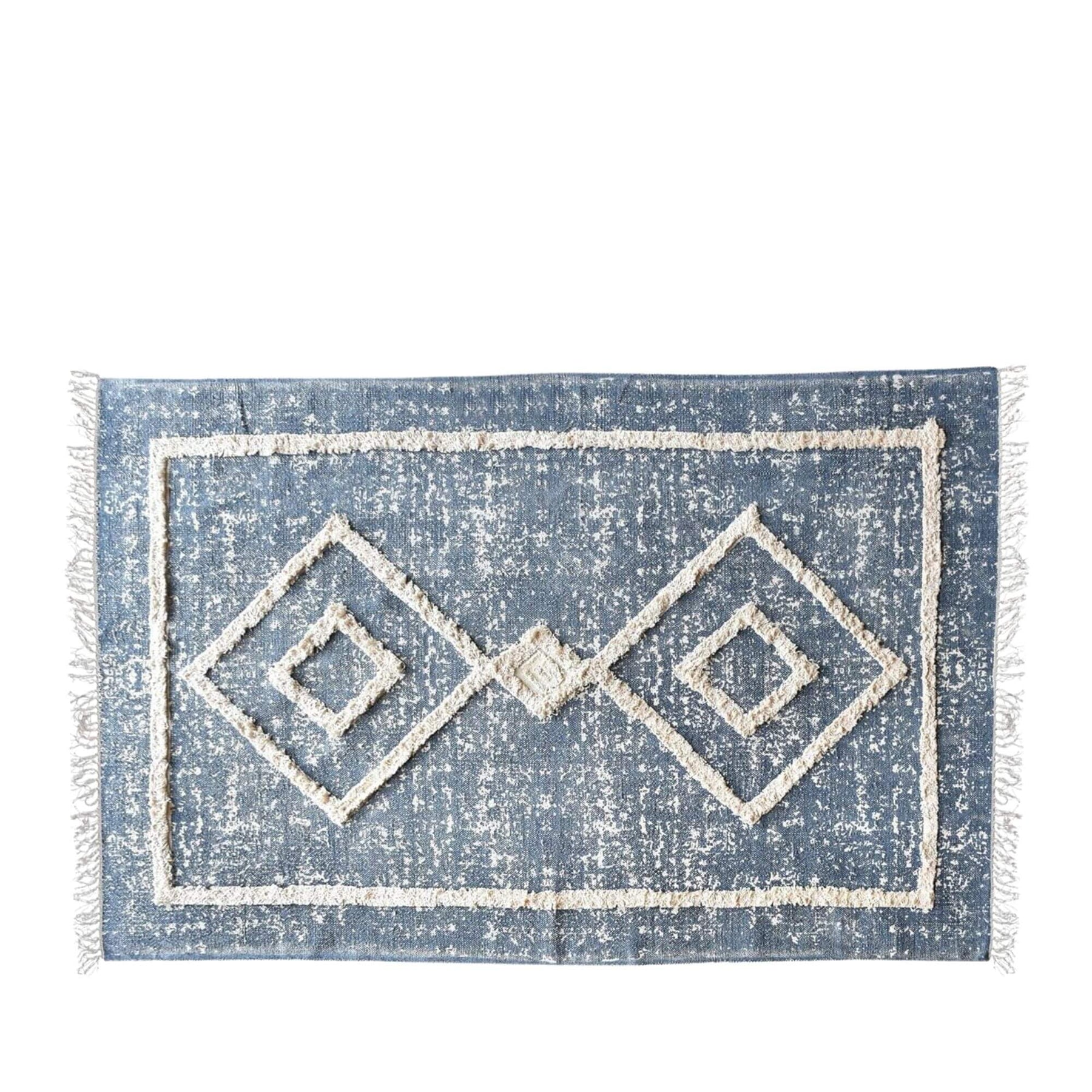 Front view of the Refren Rug showing geometric diamond motifs in soft blue and off-white tones.