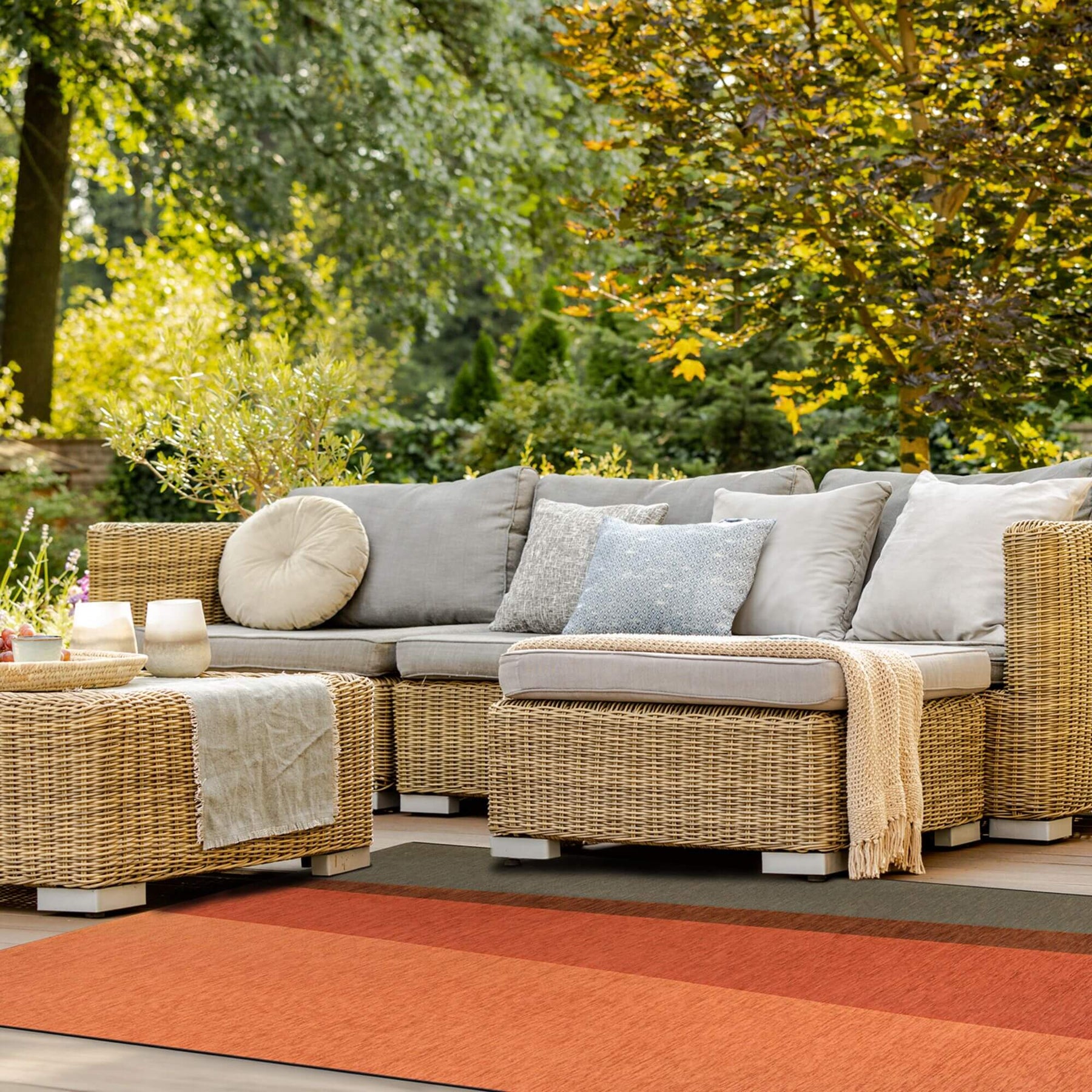 Outdoor lounge area featuring the Capri rug beneath a modular sofa.