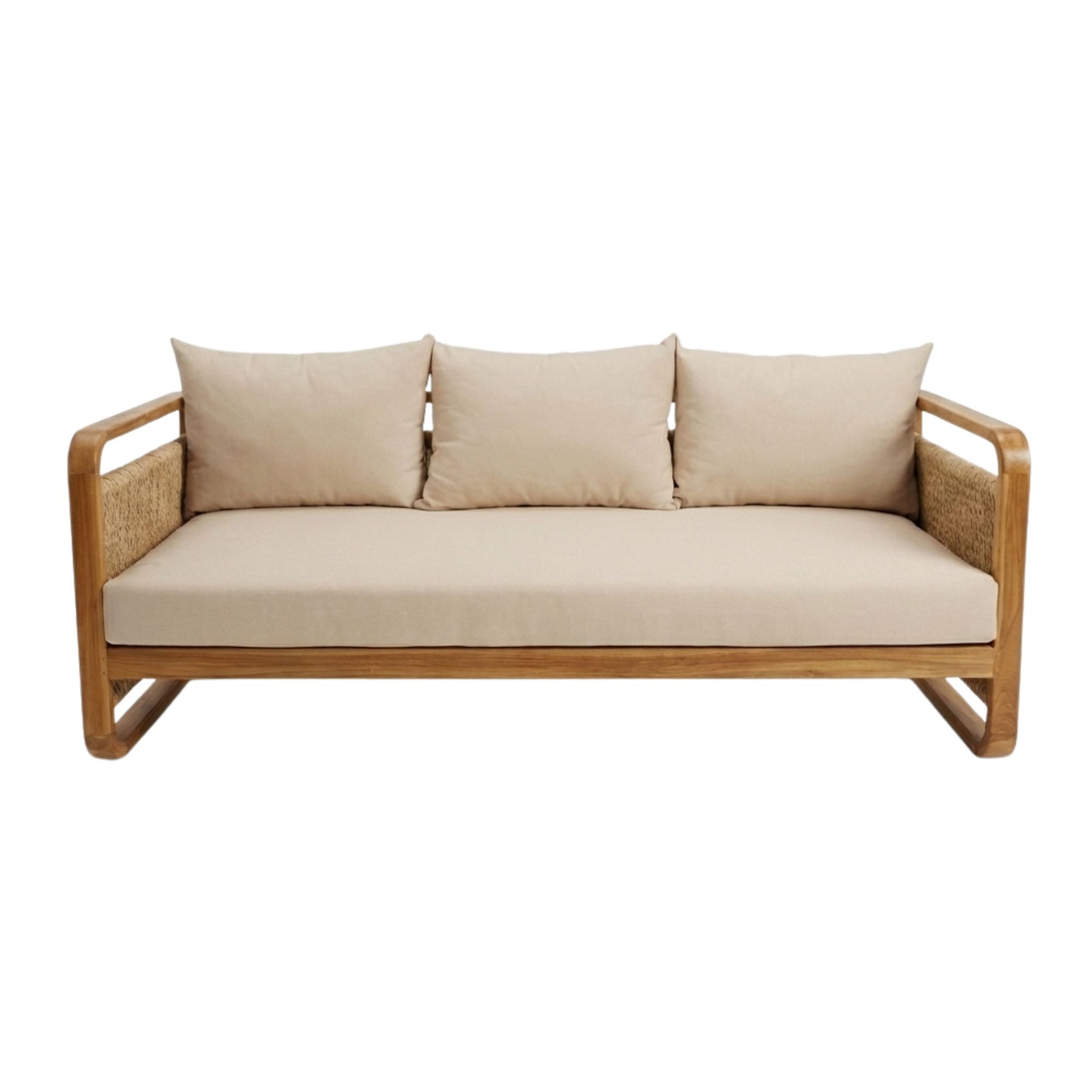 Front view of the Thai Fiber 2 Seater Sofa with teak wood frame and woven rattan sides.