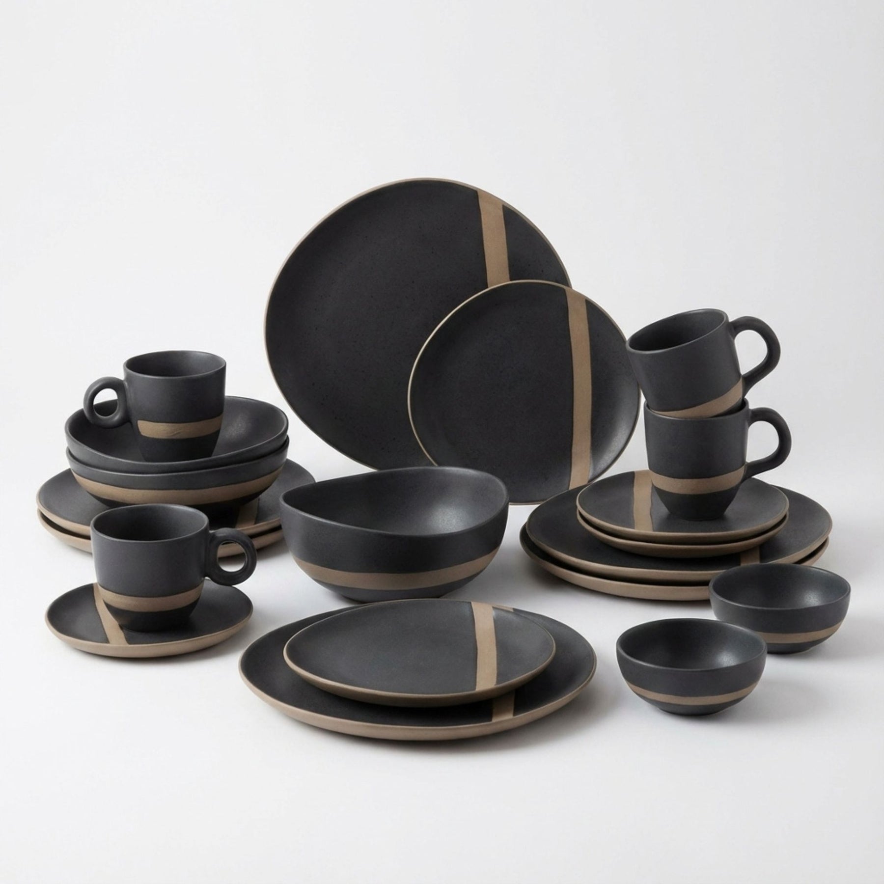 The Arcai Tableware collection stands out through its bold graphic line and matte black finish, balanced by warm natural tones. Inspired by contemporary craft, each piece blends modern design with a handcrafted sensibility.