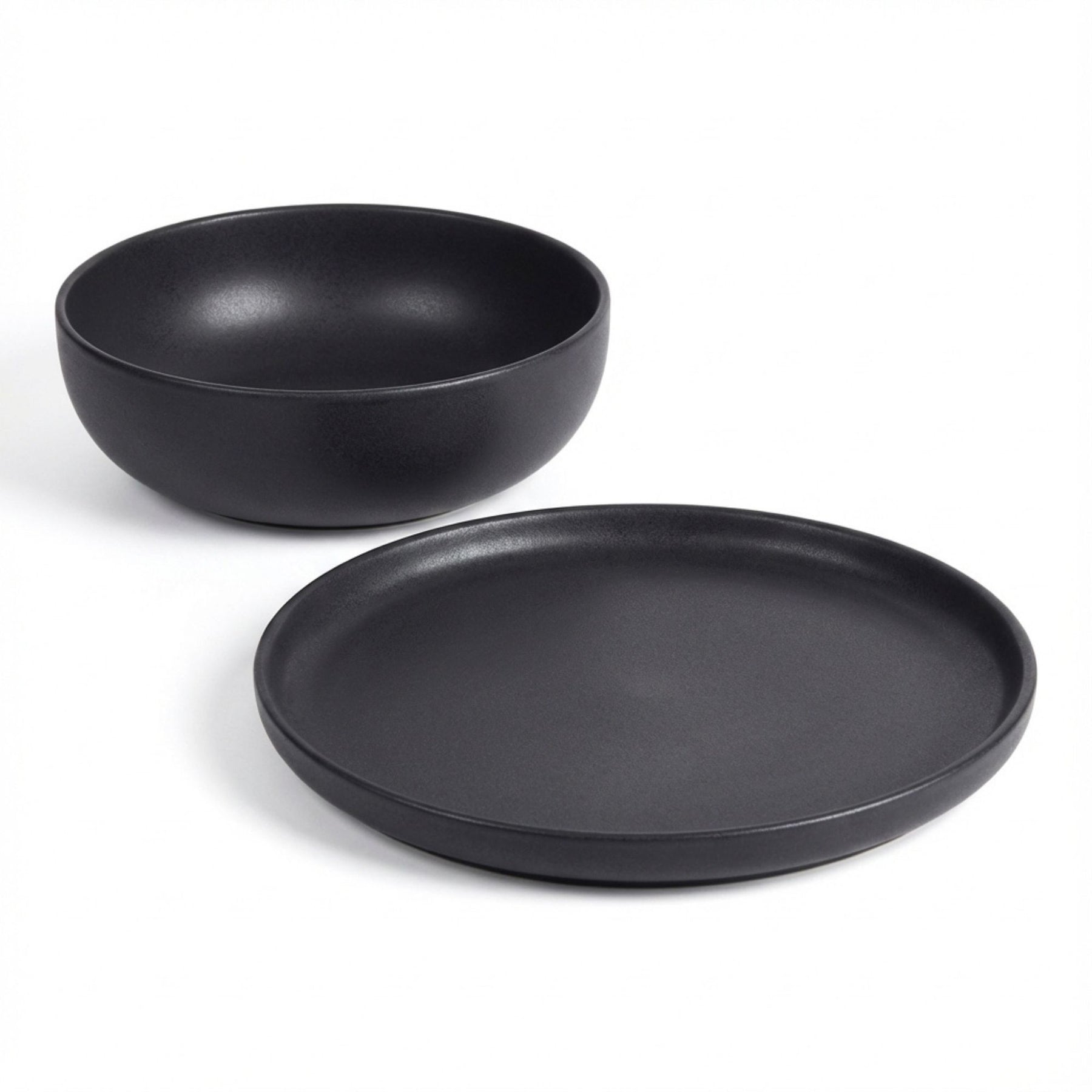Set of Uno Black ceramic tableware including plate and bowl on a white background.