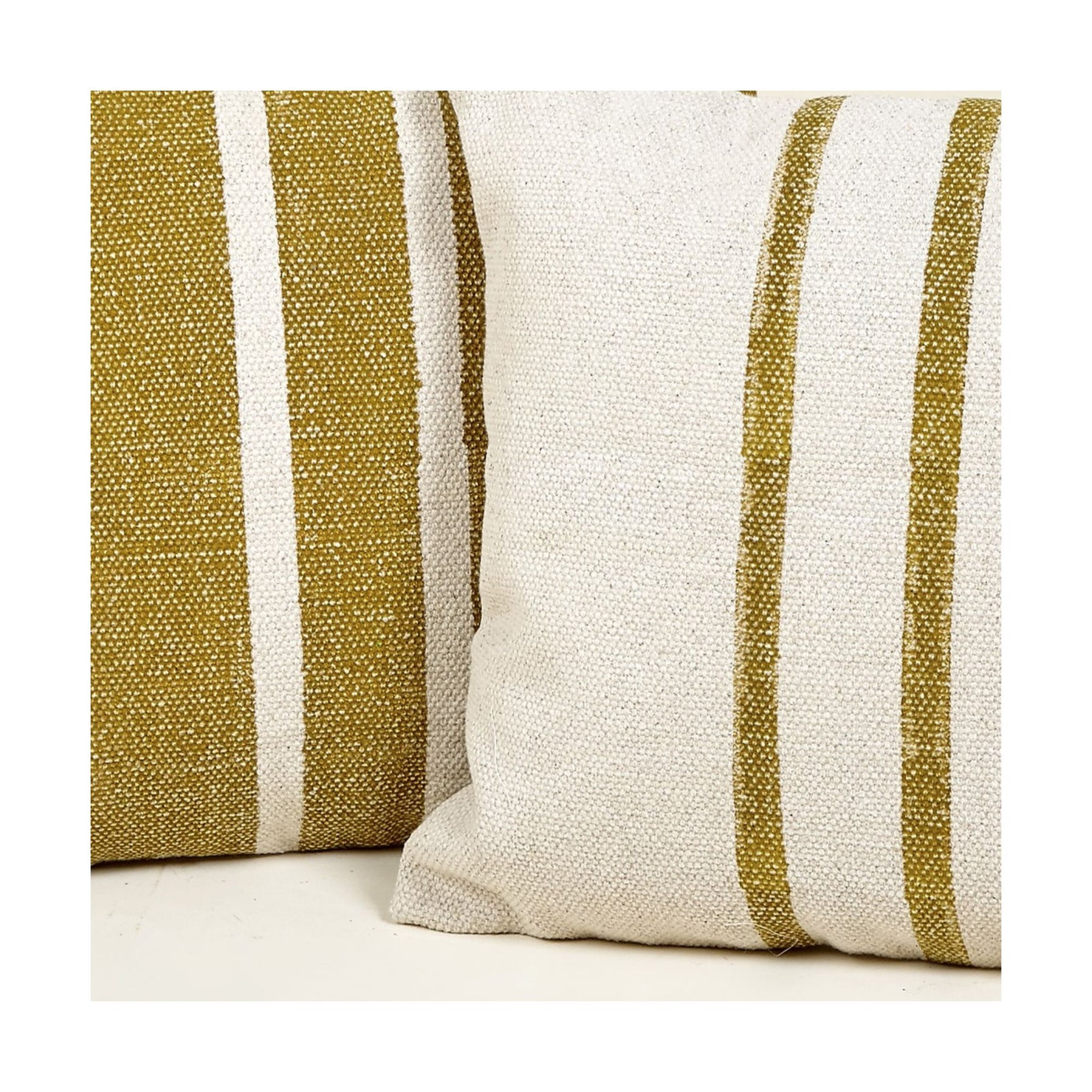 Detail of mustard and ivory striped pattern on Chandni cotton cushion. 45x45cm