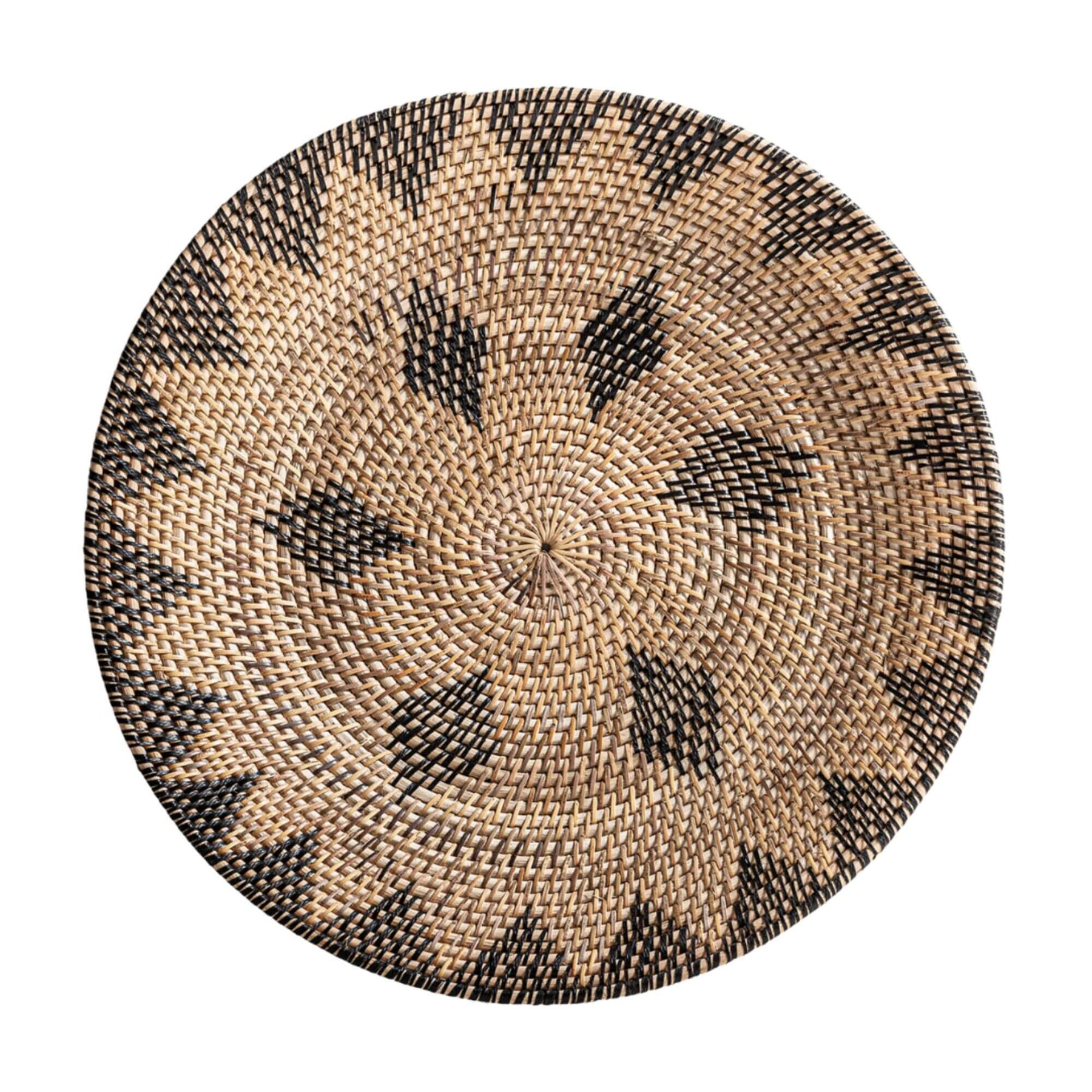 Handwoven rattan decorative plate in natural and black geometric pattern from the Lyra Collection.