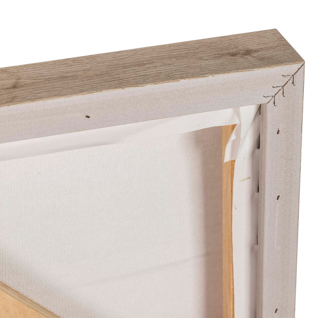 Soft Geometry Painting — abstract geometric canvas artwork with overlapping blocks in olive green, taupe, beige, and cream hues, framed in light wood.