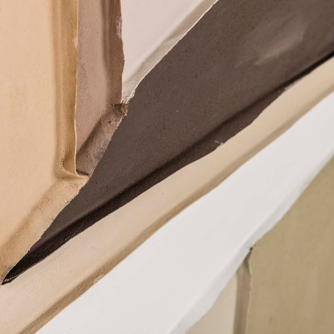 Soft Geometry Painting displayed on a neutral wall above a beige chair with striped cushion, featuring abstract shapes in beige, brown, and white tones.