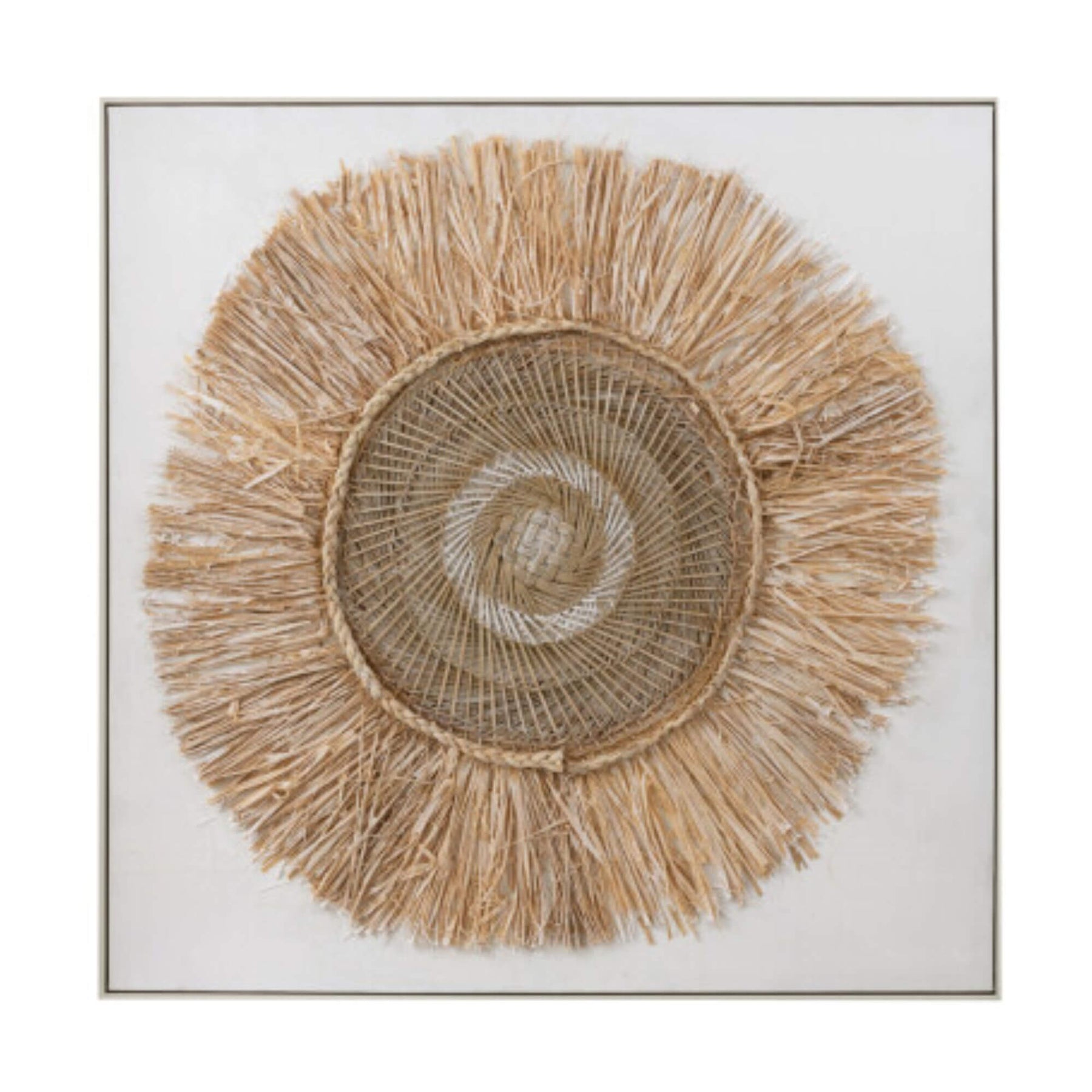 The Sun Flower Painting “M” is a stunning wall piece inspired by the radiance of the sun and the beauty of natural materials. Crafted with handwoven natural fibers arranged on a canvas base, this artwork adds warmth, texture, and a relaxed bohemian touch to any interior space.