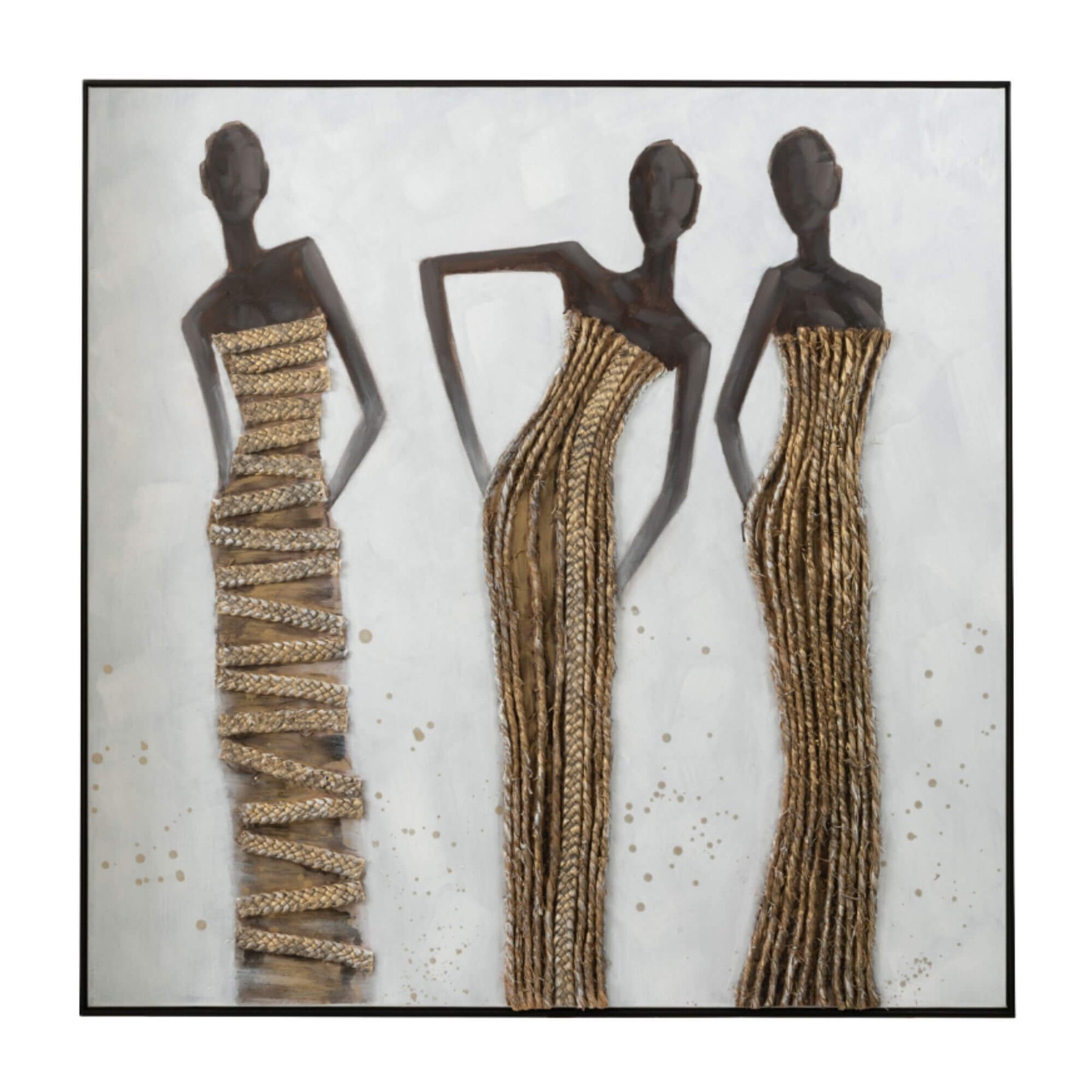 The Muses Canvas Painting showing three stylized female figures with natural fiber dresses.