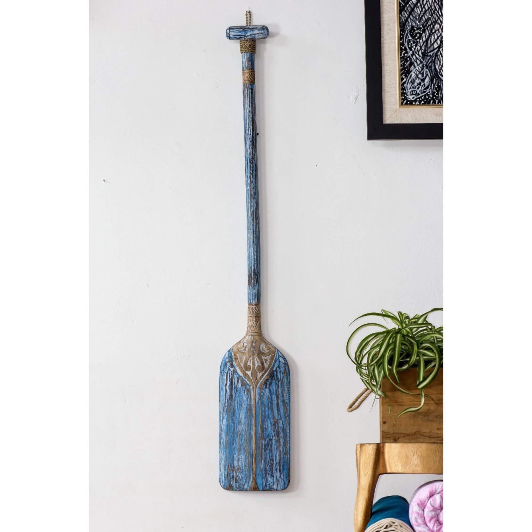 Blue paddle wall decor with distressed paint and detailed carvings.