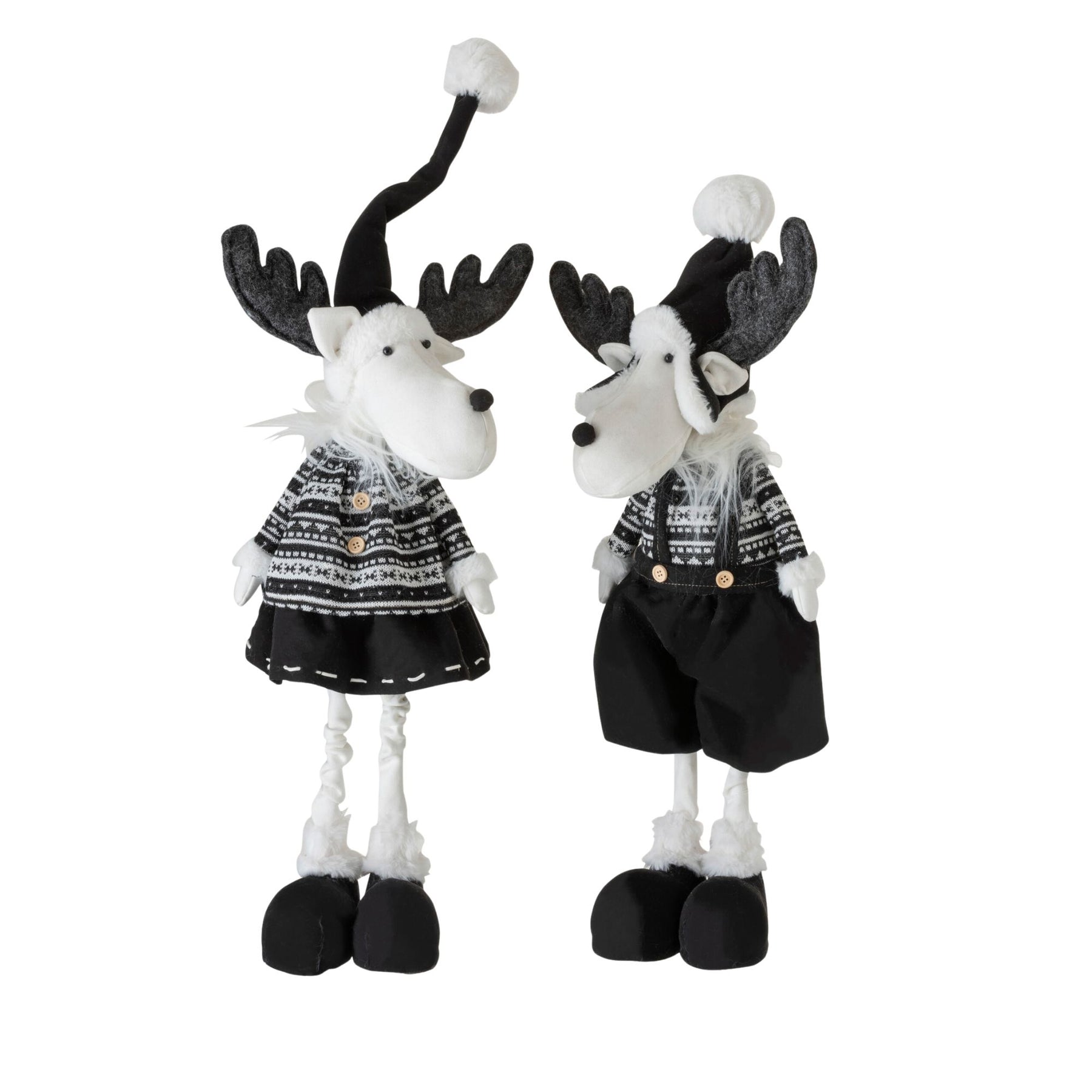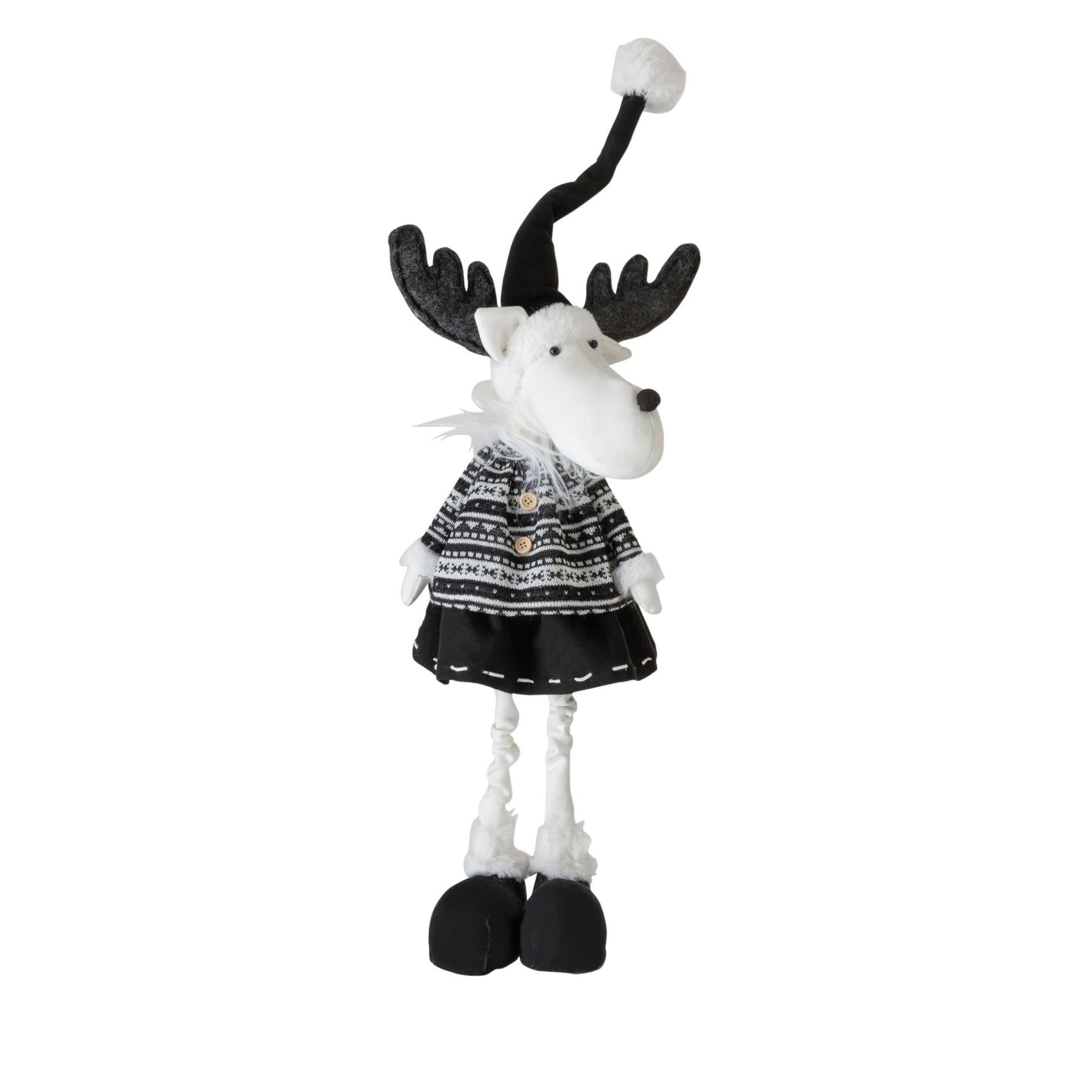 Standing view of the Broms Deer deco ornament with black trousers and winter details.