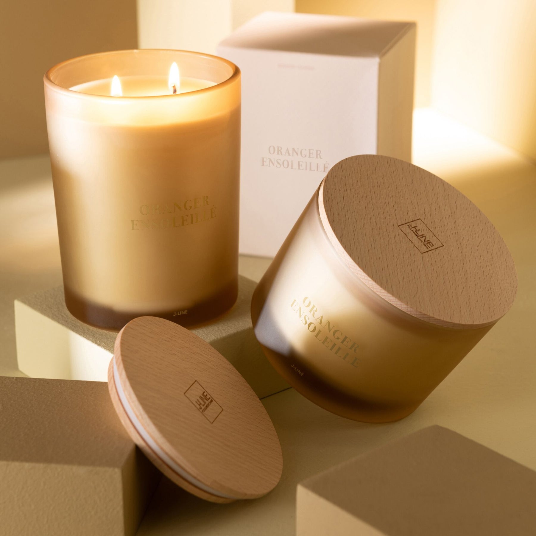 Large-size Oranger Ensoleillé candle with wooden lid beside packaging box.
