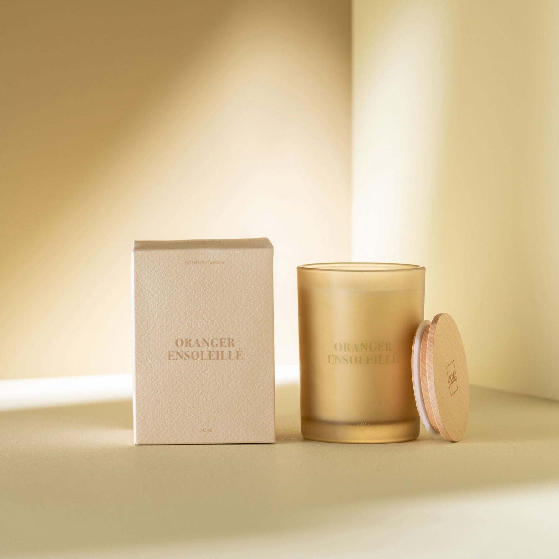 Medium-size Oranger Ensoleillé candle with wooden lid beside packaging box.