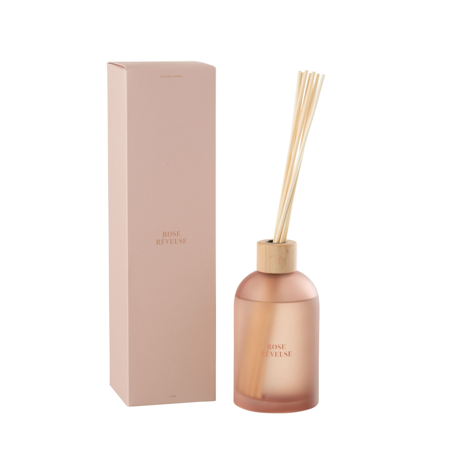 Rose Rêveuse Diffuser in frosted rose glass with reeds and packaging.