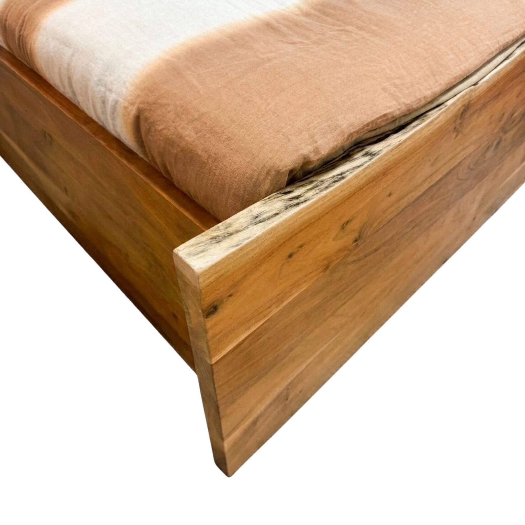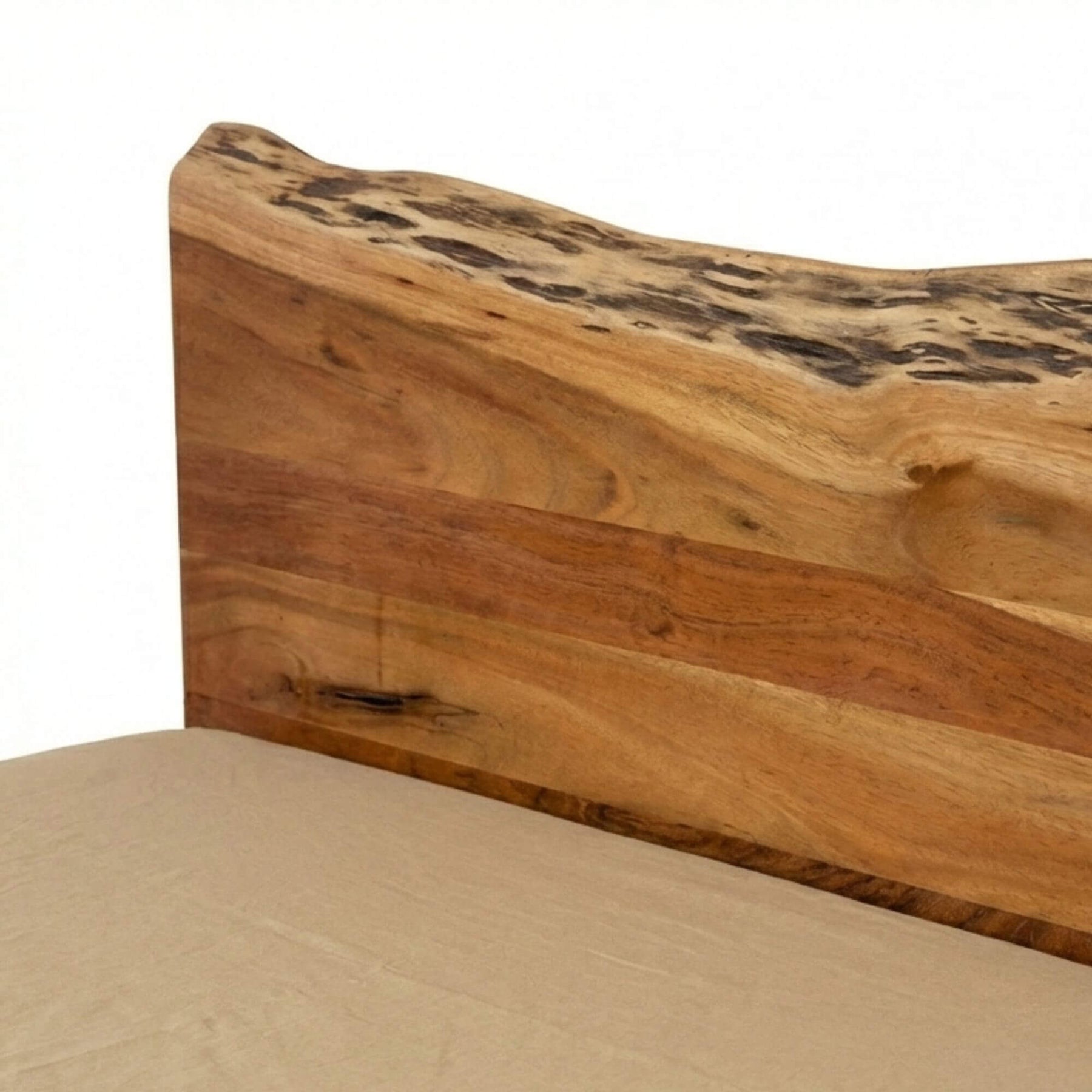Close-up of the acacia wood bed frame highlighting natural grain, knots, and live-edge detail.