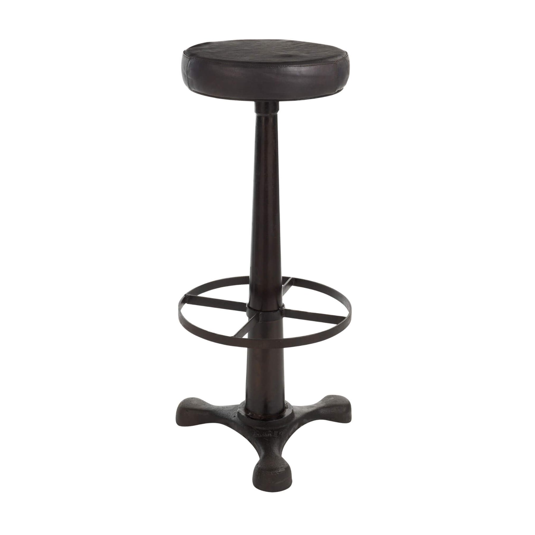 The Buffalo Bar Stool combines a sturdy iron base with a rich leather seat, offering both durability and comfort. Its timeless design features a rounded seat, integrated footrest, and bold pedestal base—perfect for adding character to kitchens, home bars, or commercial spaces.