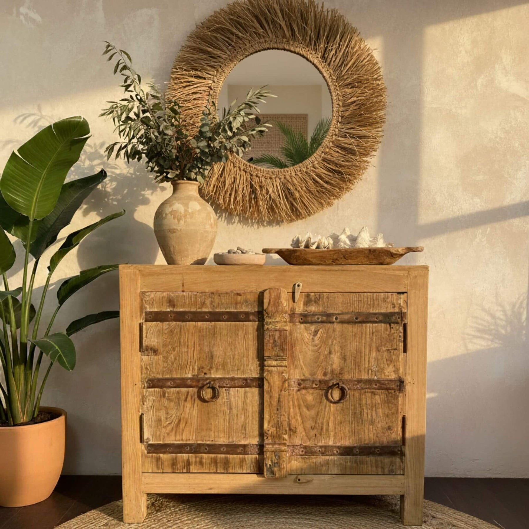 The Kalap Buffet is a striking handcrafted piece made from reclaimed wood, celebrating the beauty of natural aging, weathered textures, and artisanal Indian craftsmanship. Its solid structure, traditional metalwork, and unique patina make it a timeless statement for any interior.