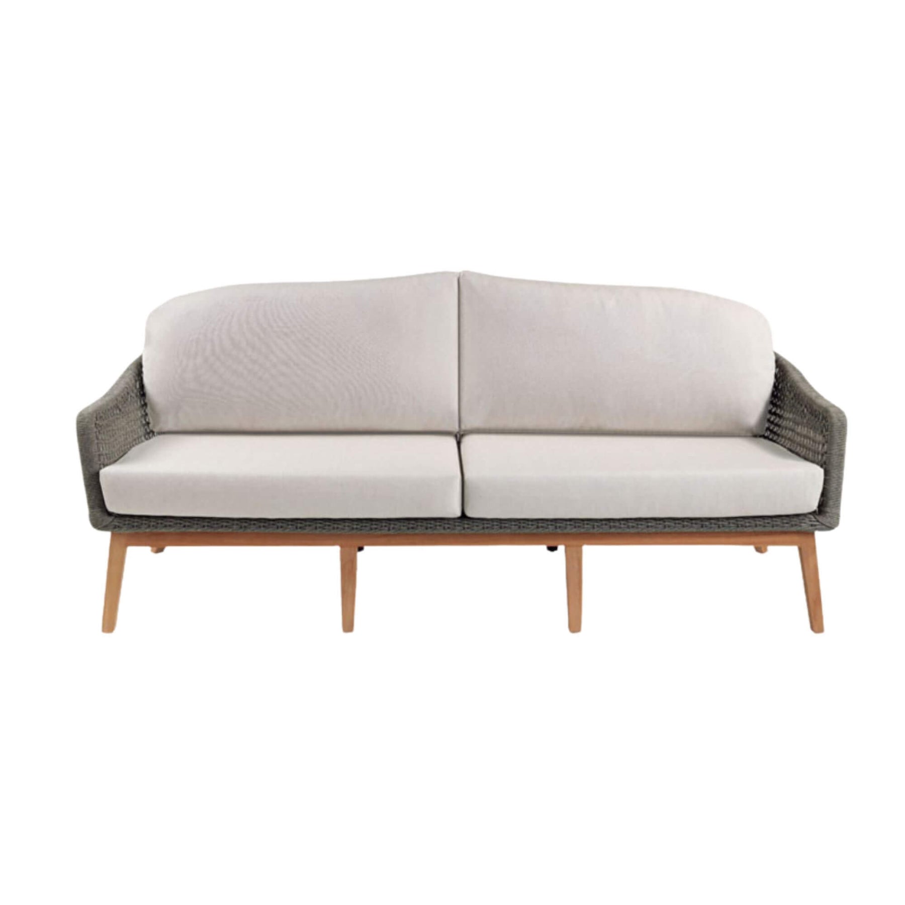 This outdoor sofa features a teak wooden frame partially covered with braided rope, giving it a rustic and natural style.